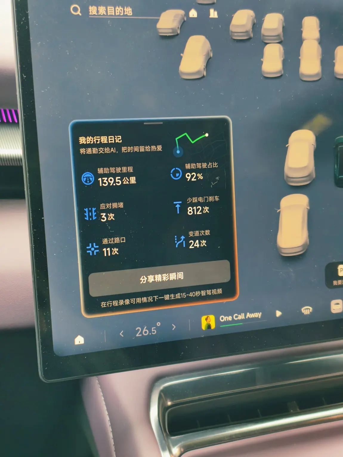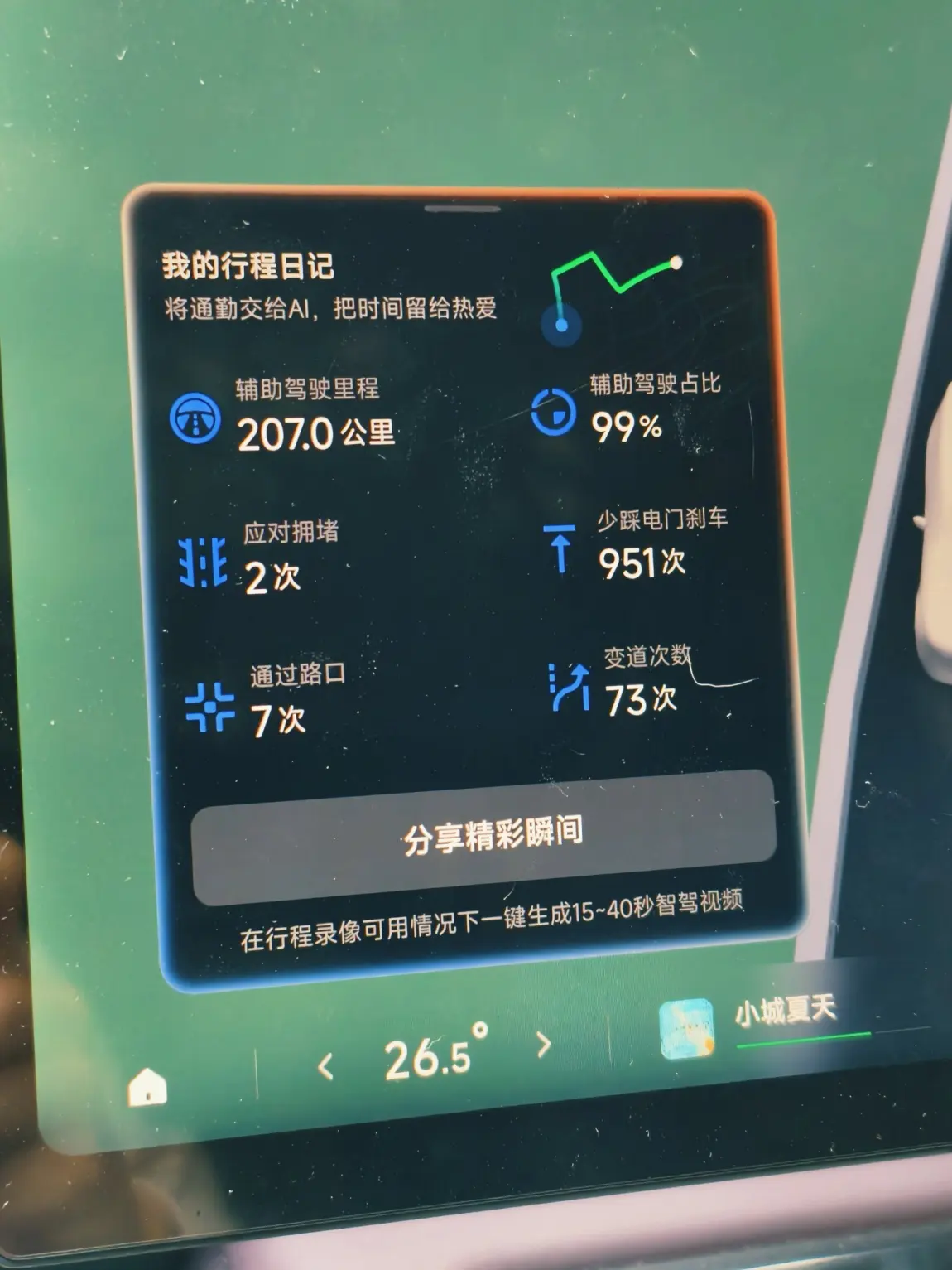 很多朋友开纯电车跑长途,最担心的就是续航焦虑,但我这台820km续航的Ultra版本,彻底打消了所有顾虑。出发前满电,全程开着26度空调和播放音乐,一路下来电耗控制得非常出色,平均电耗大概在14kWh/100km左右,和经验丰富的老司机手动驾驶的电耗相差无几。400km的路程跑完,到家门口车辆还剩余100km+续航,哪怕中途需要补电,小鹏的5C超充也完全不用慌——10分钟左右就能补能400+km,喝一杯咖啡、去服务区稍作休息的时间,就能快速回血,说实话,这样的补电速度,真的不一定比油车慢,再也不用像以前那样,看着油车快速加油,自己却要在充电桩前漫长等待,纯电车跑长途的尴尬,彻底被打破了。