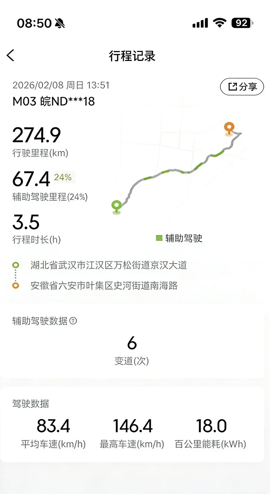 最神奇的体验莫过于在缓慢蠕动的车流中,稳稳地跟住前车,距离保持得恰到好处。遇到旁边车道稍有空隙,它还会在确保安全的前提下,主动发起变道,流畅地并入,继续前进。整整67.4公里的辅助驾驶里程,占比达到全程的24%。