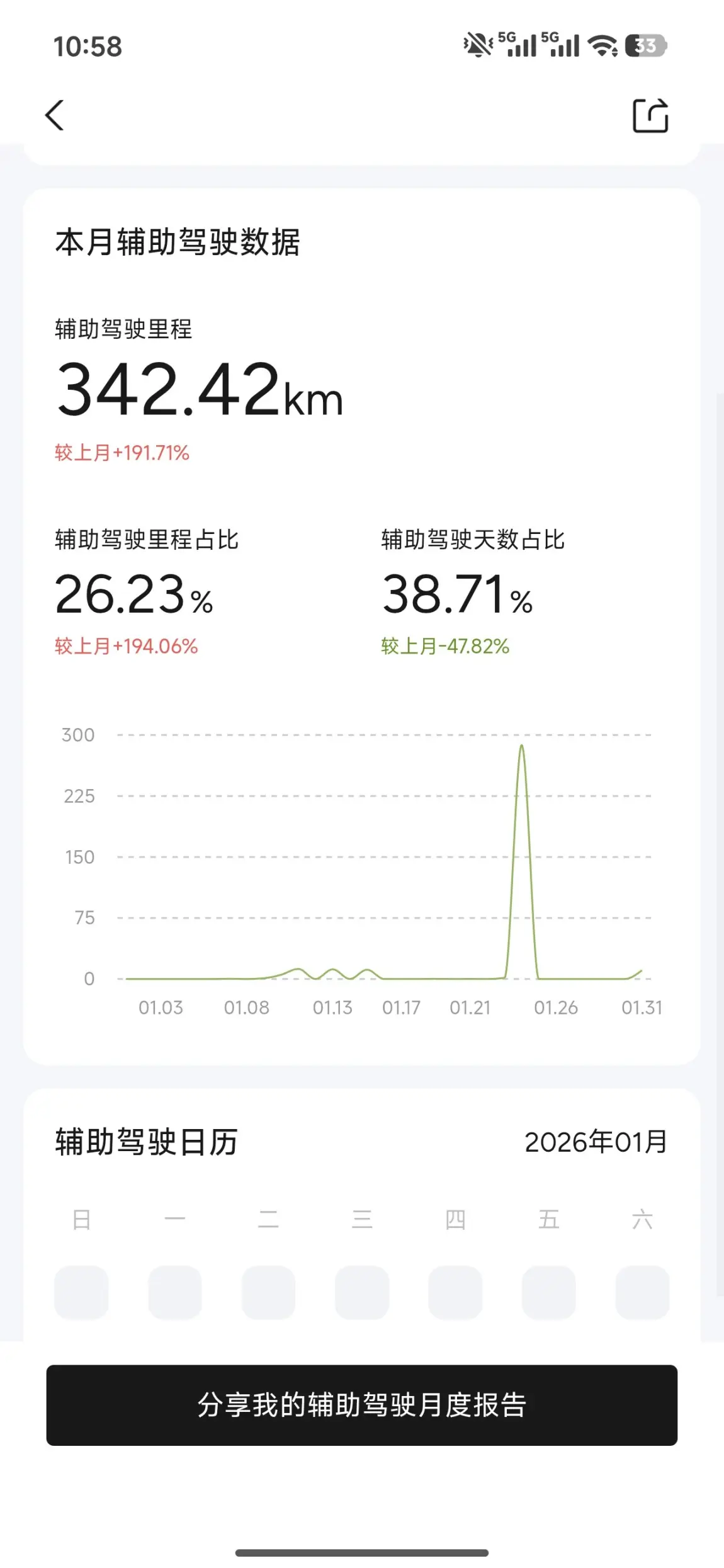 - 本月高光:1月辅助驾驶里程342.42km,较上月暴涨191.71%,里程占比直接翻倍