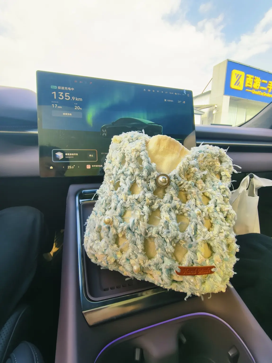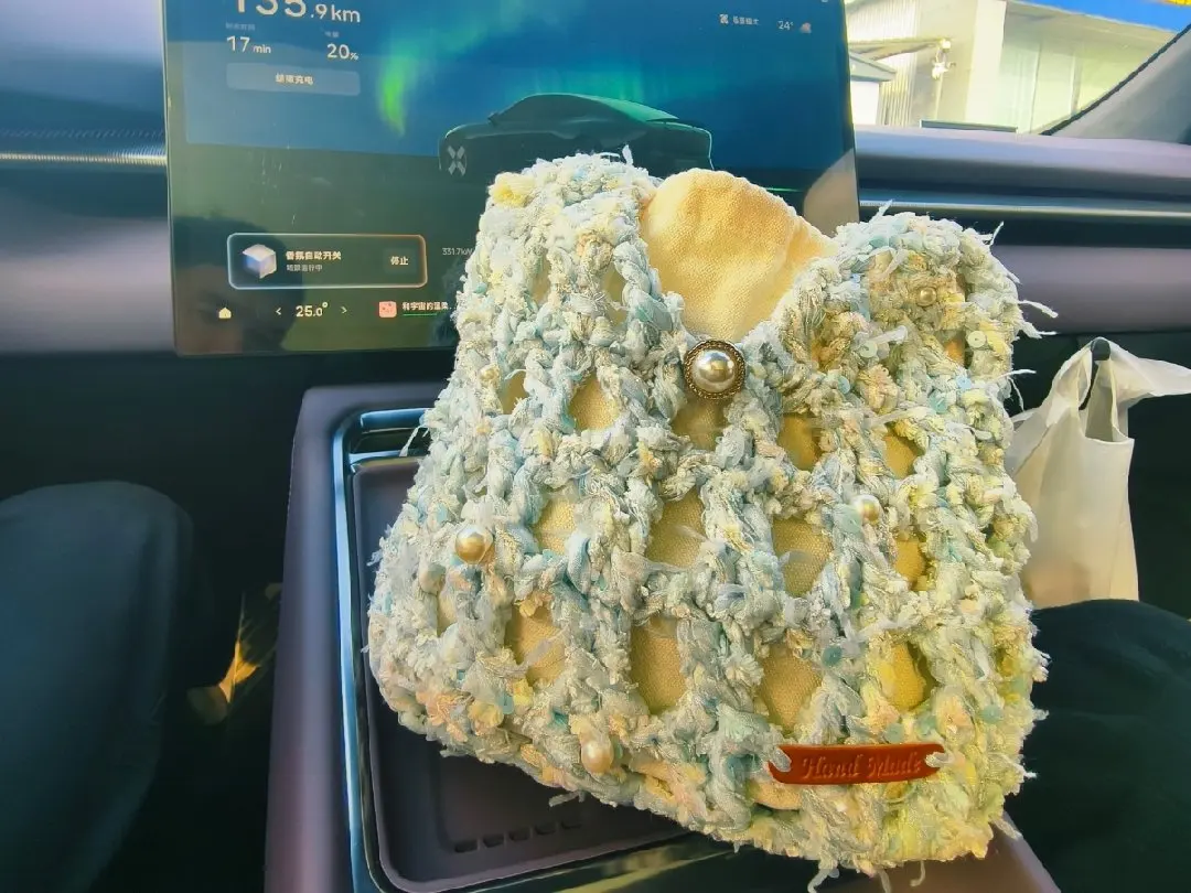 这个手工编织包,是对象一路上边听着歌边钩完成的😂,已经不记得用了多少km的路途和时间,只是每次超过1h的行程她都会从手套箱中拿出她打发时间的神器。淡蓝与米白的碎纱线交织,珍珠扣在阳光下闪着柔光,像把春天的风揉进了车里。