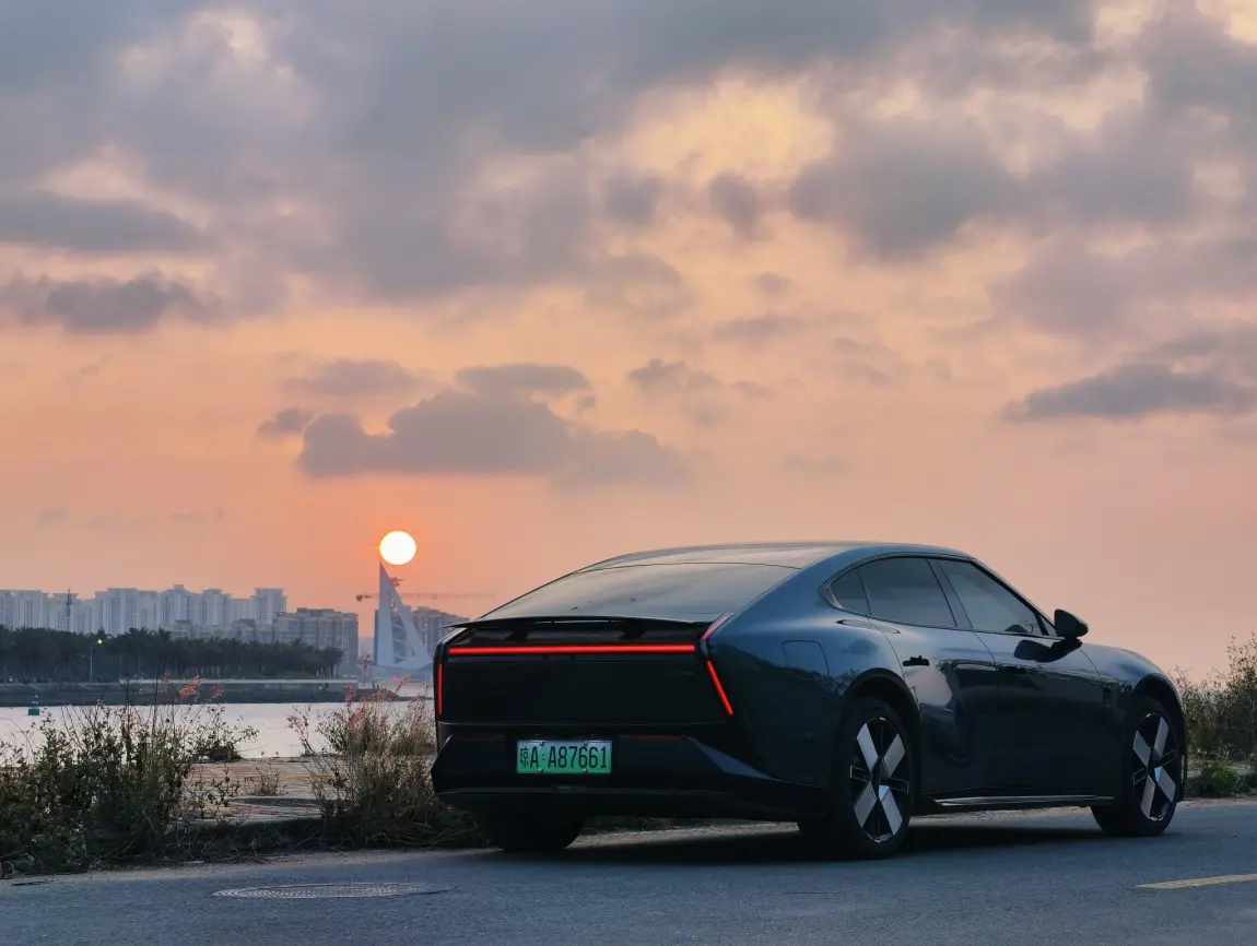 停在海边的公路旁,和爱的人靠在一起,看海浪拍着礁石,落日把天空染成橘子汽水色,小 P 的贯穿式尾灯在黄昏里亮起来,和晚霞撞了个满怀。溜背线条在余晖下流动,轮毂上的十字星,像把余晖嵌在了车轮上。