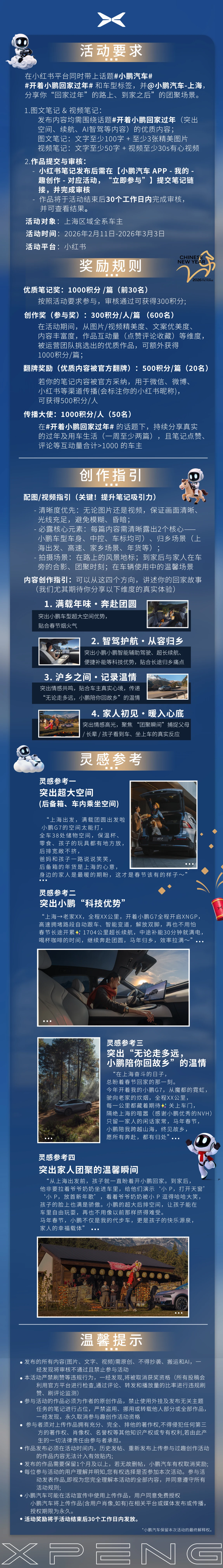 2026 春节,小鹏一路陪你奔赴团圆,现面向所有上海区域小鹏车主,正式发起#开着小鹏回家过年# 话题分享活动!2 月 11 日 - 3 月 3 日,按要求在小红书平台发布优质笔记,并上传到小鹏APP趣创作平台,即可有机会赢取积分奖励!
