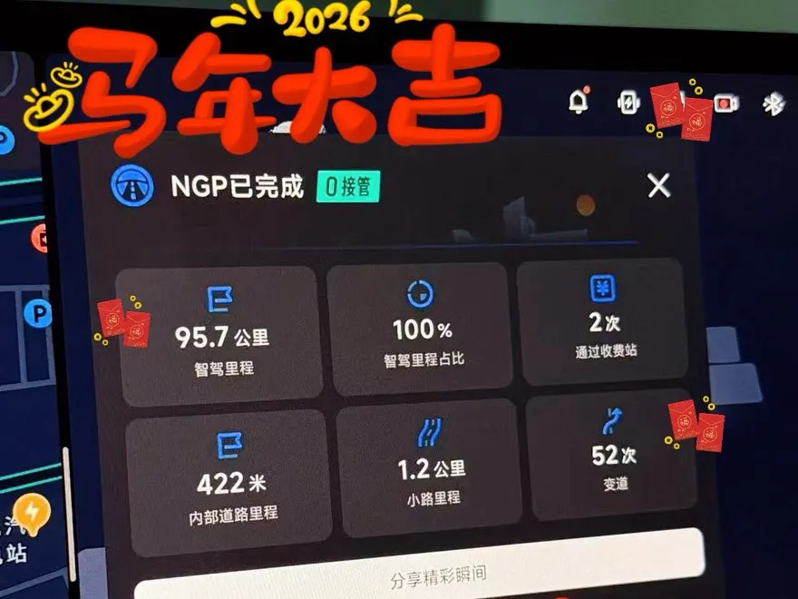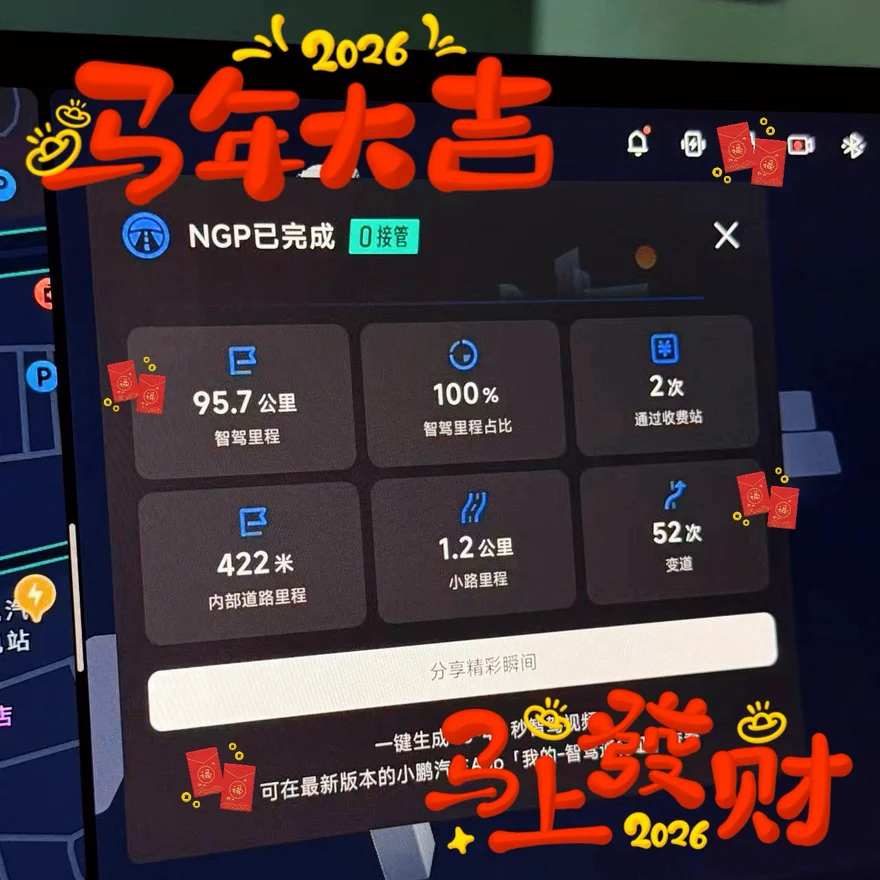 🧧握着方向盘,却看着小鹏G6自己流畅地穿梭在春运车流中,这种感觉太神奇了。整整100公里,从城市快速路到高速路段,我的G6全程自主完成—自动跟车、变道超车、进出匝道和收费站,每个动作都精准得像有个老司机在操控。而这,就是属于我的辅助驾驶高光时刻。再加上小鹏的马年春节彩蛋,熟悉的小P化身酷酷的骑士,随着车子行驶马儿就在屏幕上纵情奔驰,画面又惊喜又可爱,也寓意着马年“一马平川”既应景又有趣,情绪价值直接拉满!🎉🎉🎉