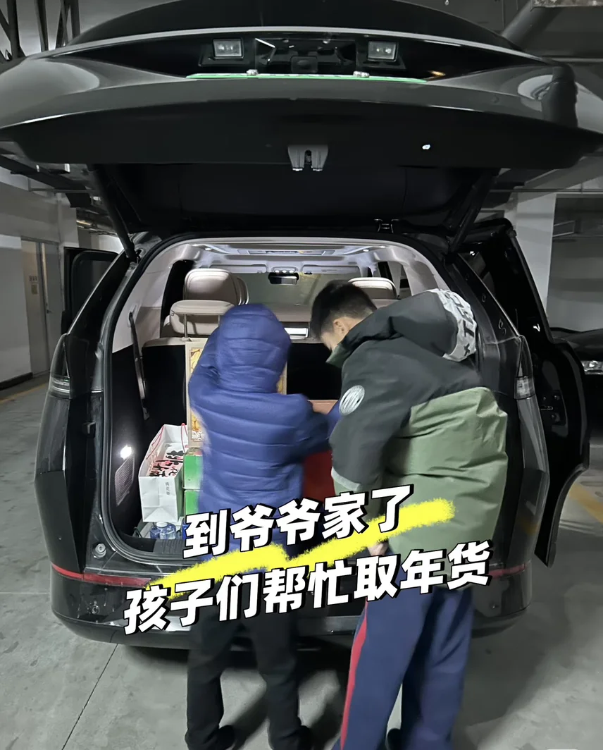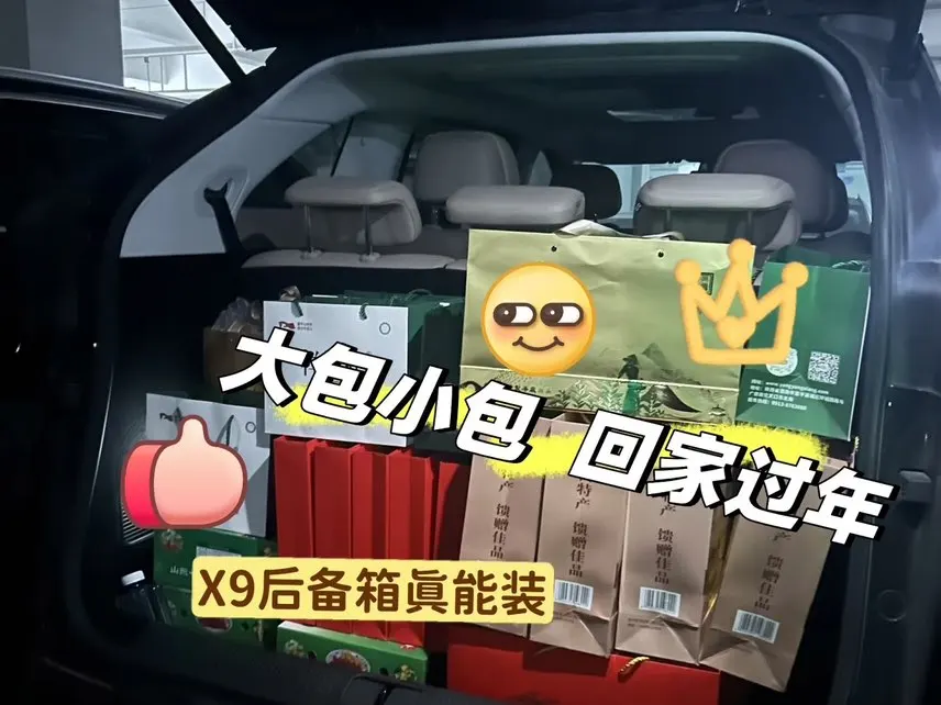 1️⃣带娃回老家,给老人送年货节礼,小鹏X9的空间真是给力,后备箱放了好多礼盒,还能再放👍🏻满满的年货礼盒,小鹏X9当仁不让,全能装下。