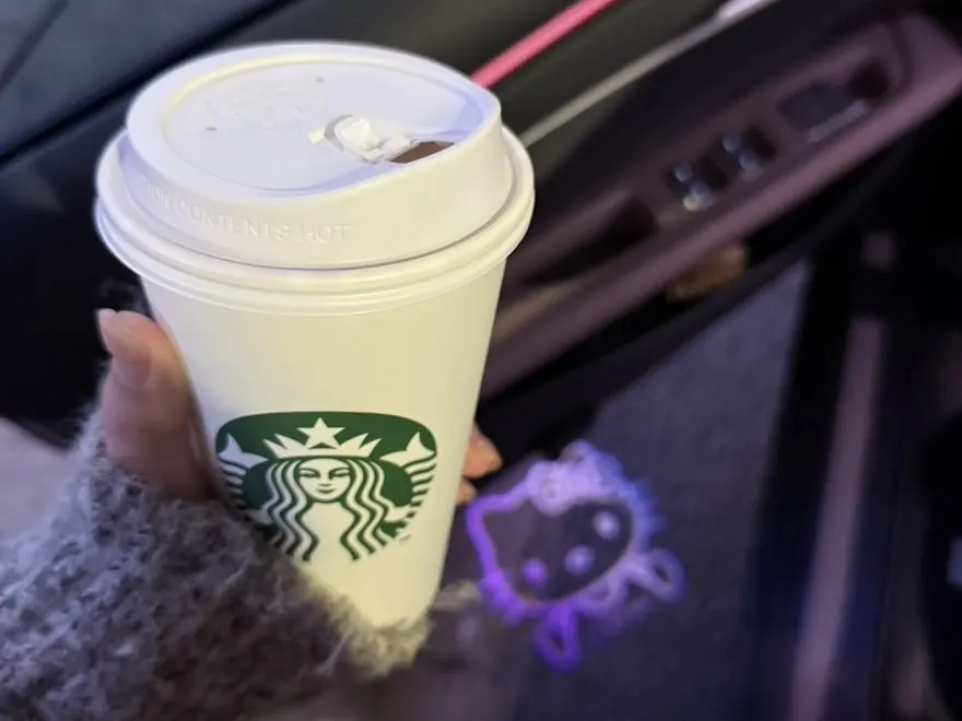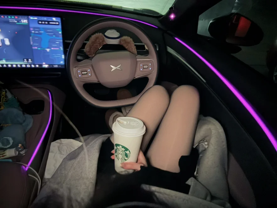 我尤其喜欢它的内饰。夜晚,当紫色的氛围灯带缓缓亮起,整个座舱瞬间变得温柔又治愈。中控屏上清晰的导航界面,方向盘上可爱的毛绒装饰,再配上一杯温热的星巴克,即使是一个人待在车里,也能感受到满满的幸福感。