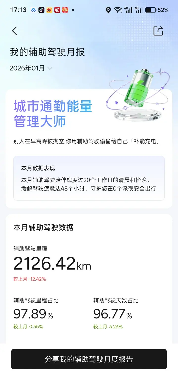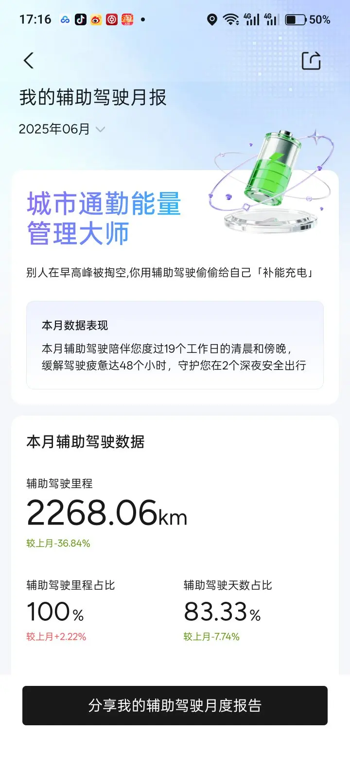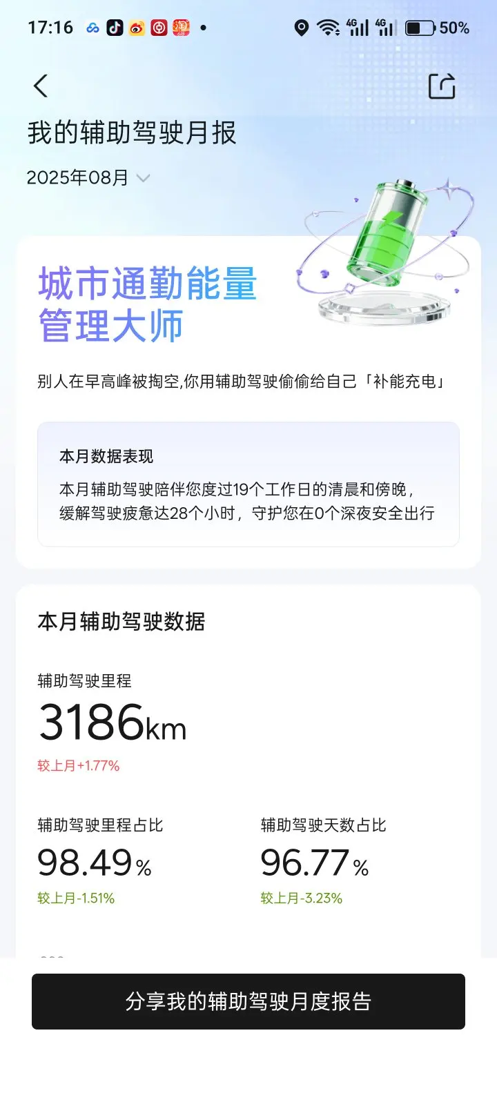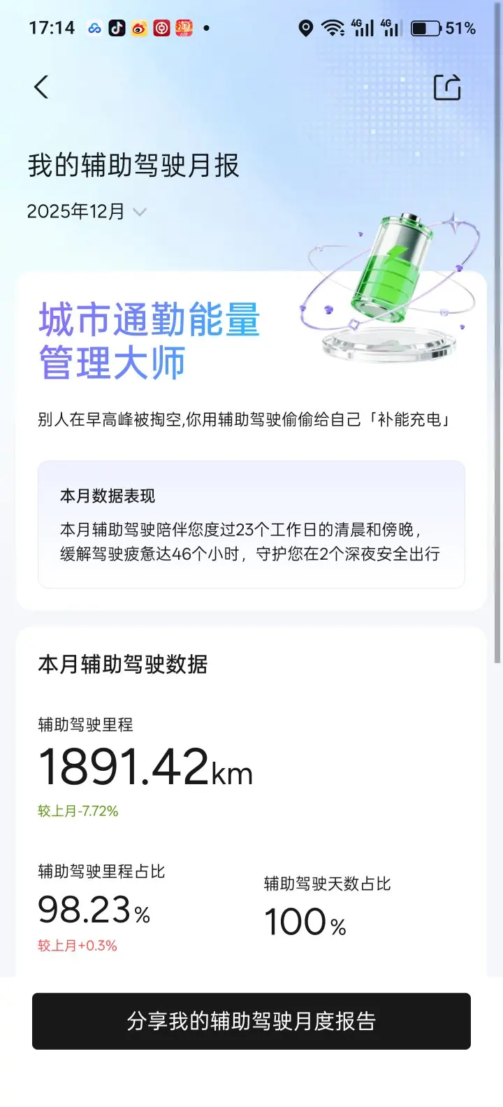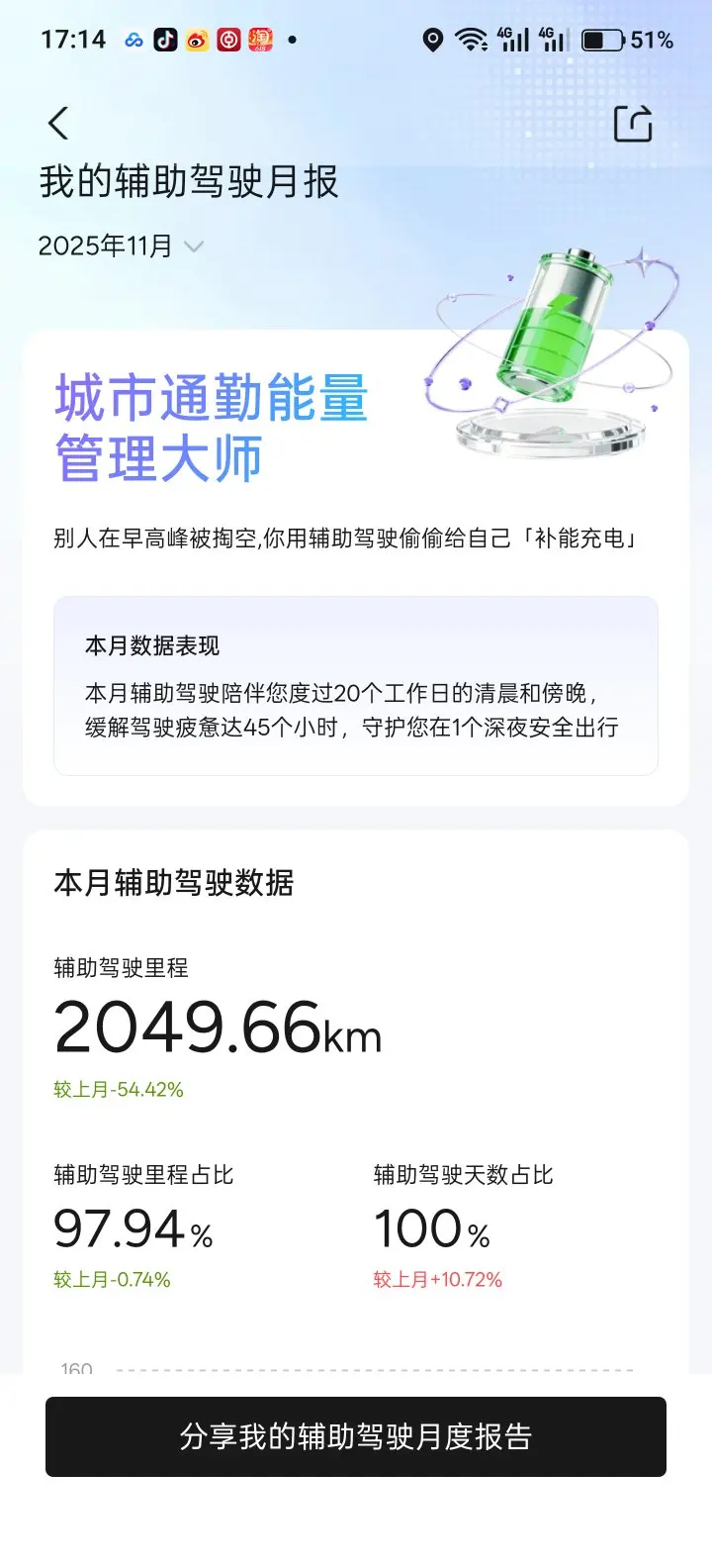 可以说,鹏厂的智驾完全没辜负我的信任。这三年自驾游开了70多个城市,途中几乎全靠NGP续命。如果没有NGP,我手动开,估计连5万公里都开不到。自25年来每个月的智驾里程占比都没低于97%,这个占比没记录LCC,算上的话,至少98%。