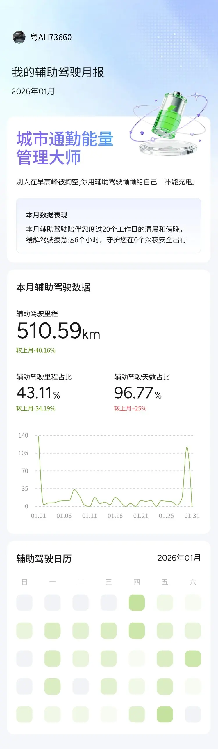 #我的辅助驾驶高光时刻# 成为鹏友不知不觉924个日日夜夜,辅助驾驶25167公丨,约等于走完一遍中国陆地边境线,超越98.43%的鹏友,凌晨智驾也安全到达,其中有5个深夜出行。就在最近的2026年1月份,辅助驾驶就达到510公里,辅助驾驶天数占比达到96.77%,几乎天天都有辅助驾驶出行。