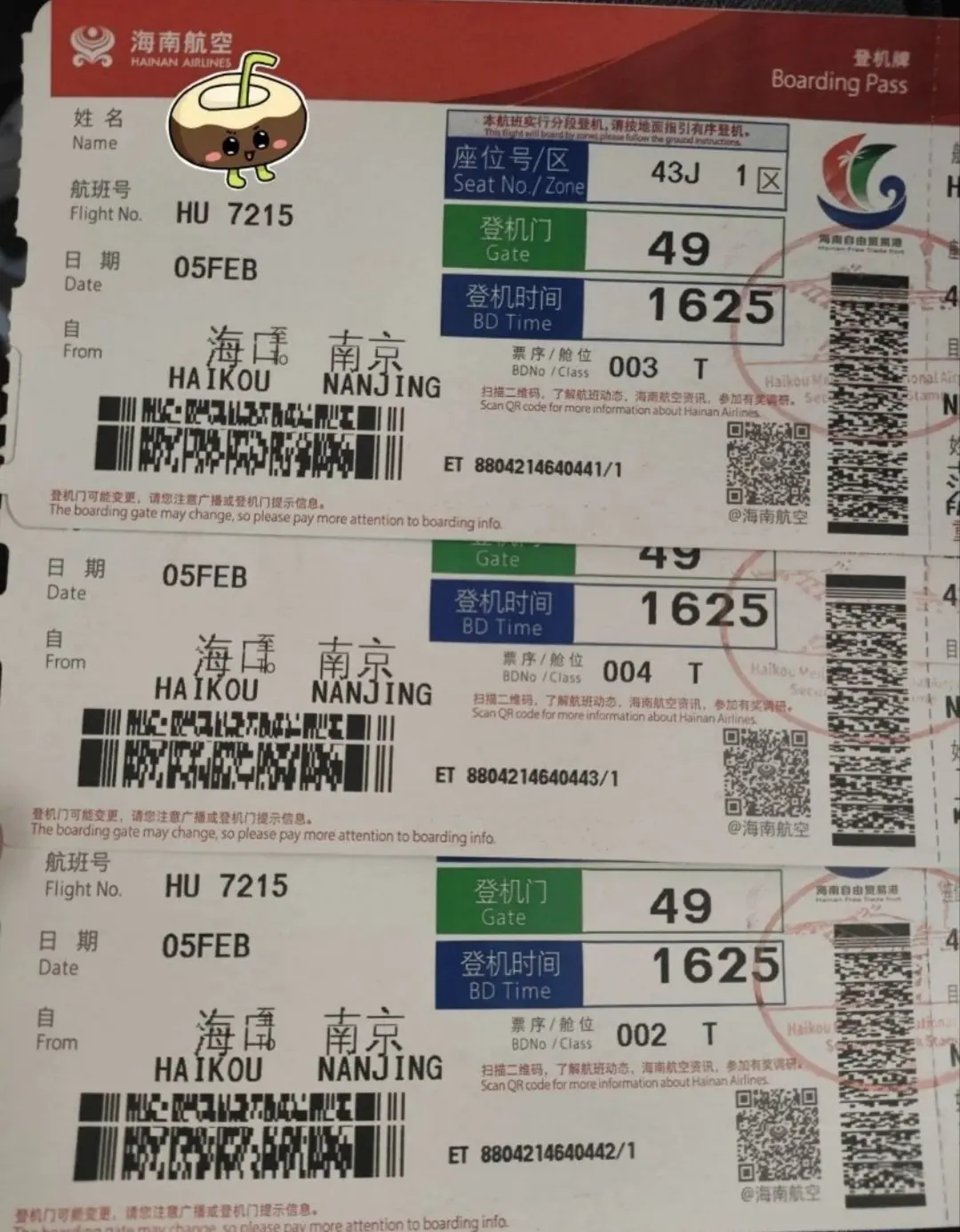 下午17:05搭乘海航HU7215从海口美兰机场T2起飞,约2小时35分钟后于19:40抵达南京禄口机场T1 。提前在美兰T2办好值机,满载海南的暖阳与年货落地金陵。