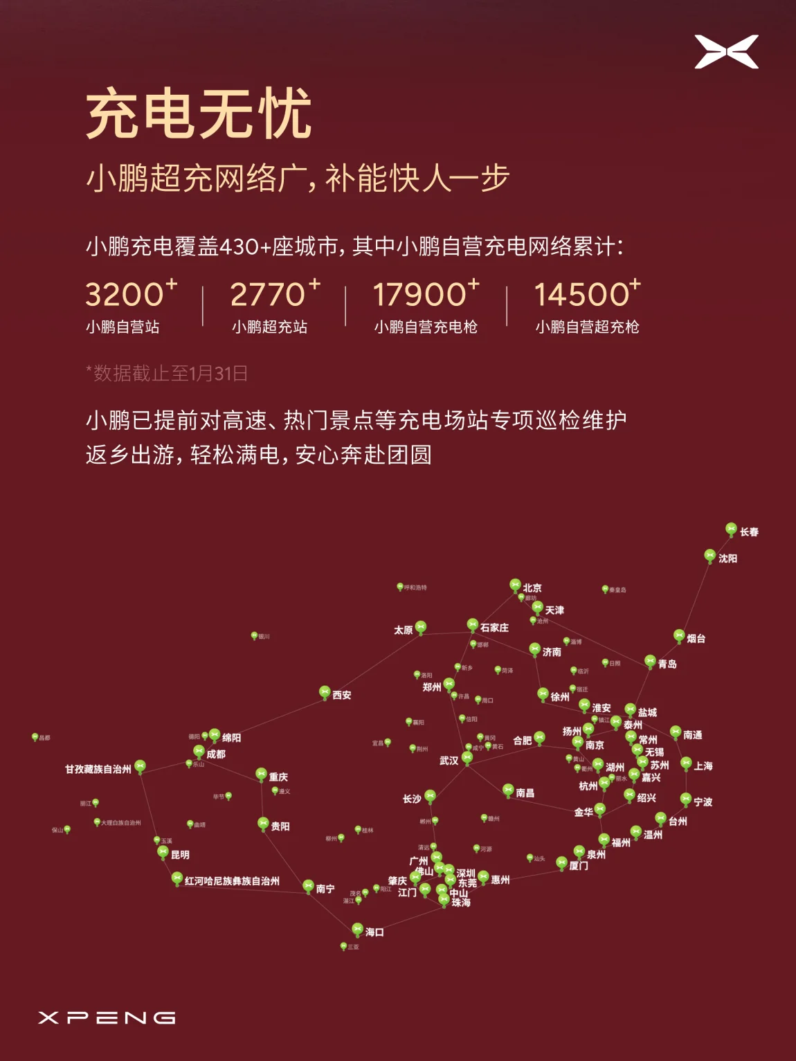 为护航春运出行,小鹏汽车已提前对高速及热门景区周边充电网络完成专项巡检维护,保障补能效率。