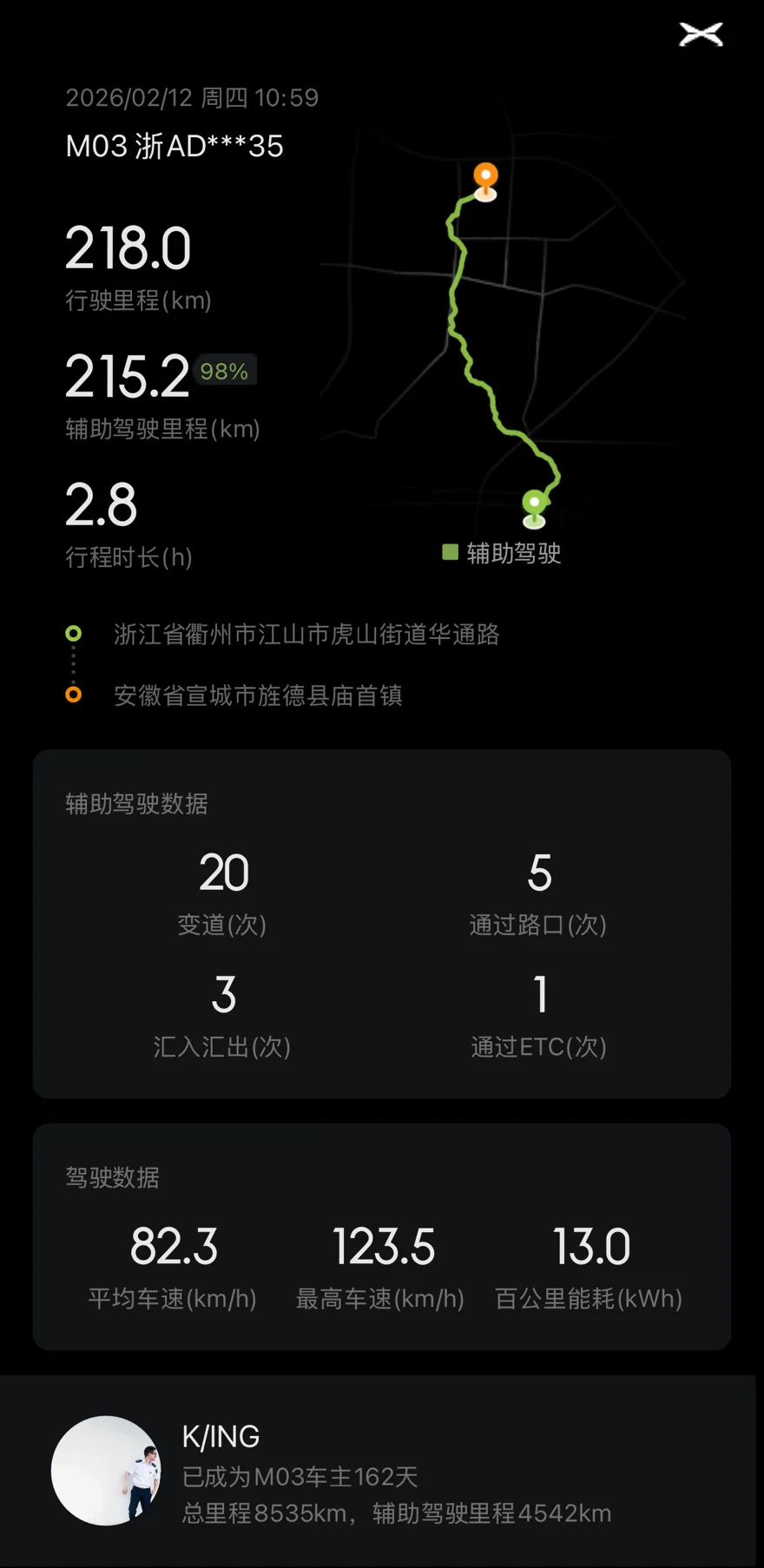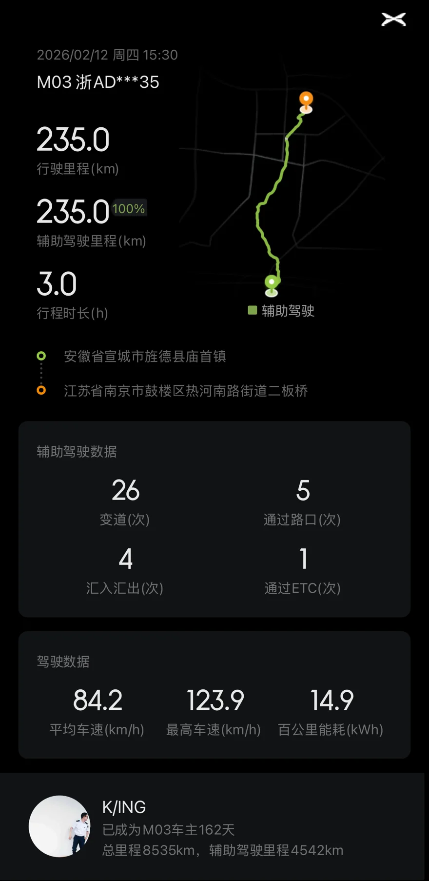 平时短途通勤也不能准确感受M03续航,趁着春节返乡,天气也是不热不冷18度左右,从浙江衢州开到南京特意在中途充电。
