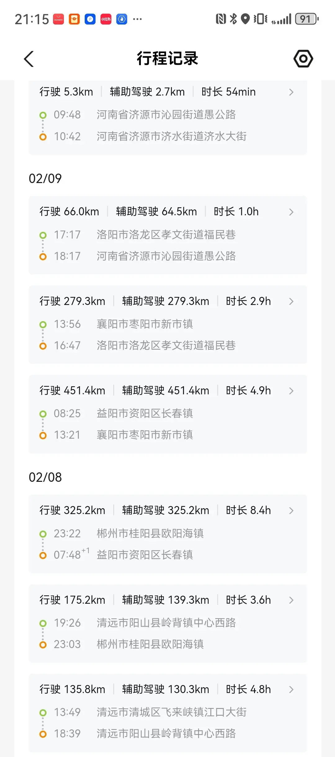 这次行程横跨广东、湖南、湖北、河南四省,全程高速为主,复杂路况和长时间驾驶的双重考验,让我彻底见识了小鹏辅助驾驶的硬实力。从行程记录来看,整个旅途辅助驾驶里程占比高达96%-100%,最长一次连续智驾451.4公里,从益阳一路到襄阳,全程无需人工接管,系统在跟车、自动变道、识别大货车、上下匝道时都丝滑流畅,预判精准,彻底解放了我的双手和注意力。