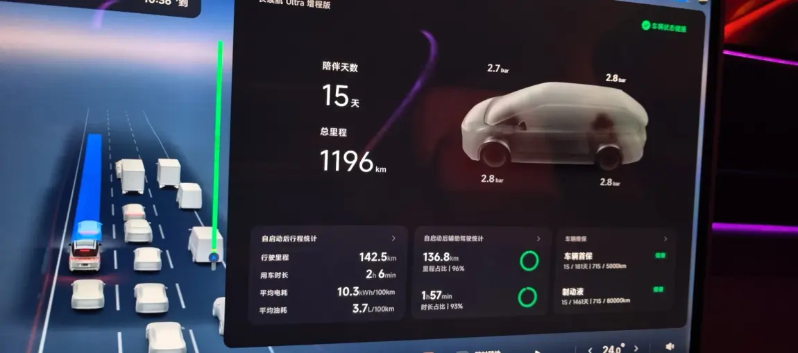 能耗表现也让我惊喜不已。满电状态下纯电续航显示452km,高速行驶时增程系统高效运转,第一段行程电耗仅10.3kWh/100km、油耗3.7L/100km,后续路段电耗低至6.6kWh/100km。更关键的是补能效率,26分钟就能从低电量充至满电,中途短暂休整的时间,就能让车辆“满血复活”,完全没有续航焦虑。