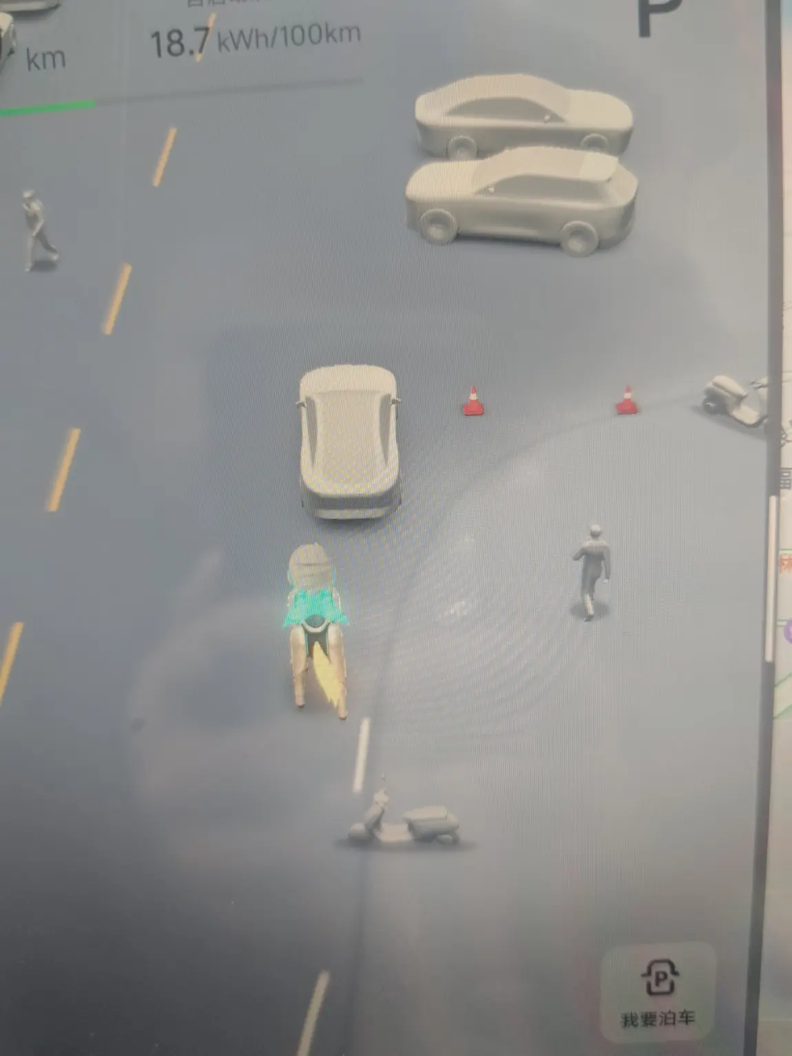 挡风玻璃沉入深灰,世界被重构。发光的道路轮廓在雾中延展,蓝色箭头指向家的方向。绿色光点代表同向车辆,红色是来车,连地面可能的障碍都标记为黄色菱形。风雨仍在,却成了这幅精密电子画卷上半透明的背景幕布。
