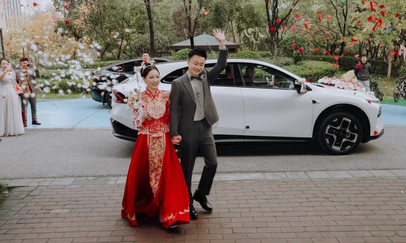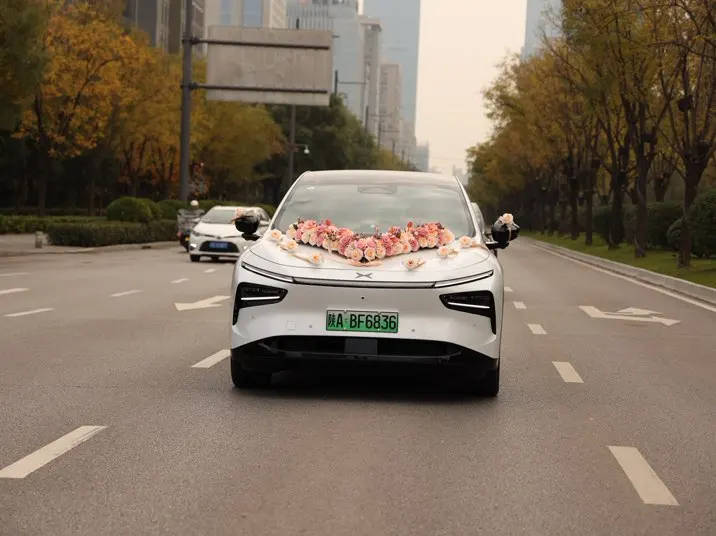 去年过去提的小鹏G7,我和我老婆都非常喜欢这款车,无论是外观还是内饰。所以在我们两11月结婚的时候,第一时间就想到用我们俩的G7来当婚车头车,当天我们就对婚车进行了布置和装饰,装饰完真的绝美,当天接亲路上,G7 就是全场最靓的仔!