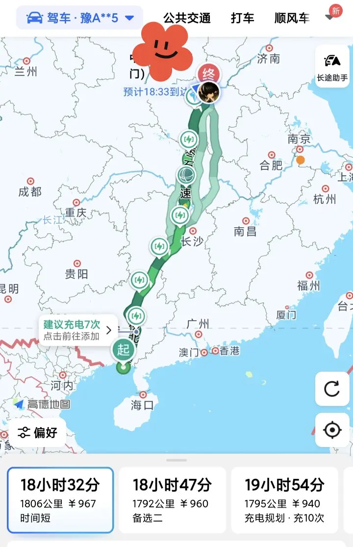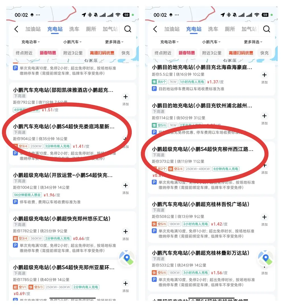 从北海住的酒店(澜笠别院)到郑州走的路线选择了柳北-泉南-呼北-华常-枣石-焦唐段高速,导航距离1806公里,时间18小时32分。最后,加上充电休息,实际用了30个小时左右。充电利用高德地图添加充电站途径点,筛选了两个下高速附近的小鹏超充,分别是1️⃣小鹏S4超充柳州西江路48号站和2️⃣小鹏S4超充湖南娄底鸿星新天地站。其他都是在高速服务区充。