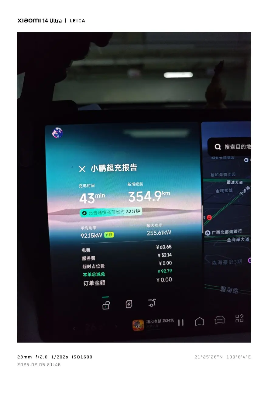 主要是其中两次用的小鹏超充积分抵扣没花钱,这也是作为小鹏车主的福利。G9这么大的车,三大一小,满载行李,这个高速用电成本得益于优秀的能耗控制。对比油车,这个百公里1毛6分钱的用车成本跟不要钱有啥区别。最关键的是,这么长的路程,中间休息电车的体验是油车不能比的。