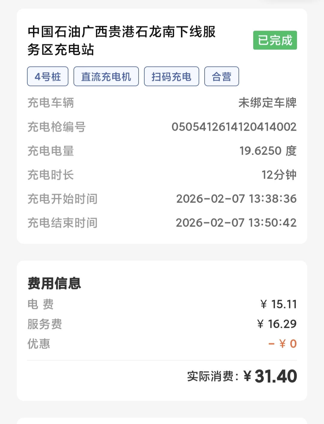 2月7日上午11点左右出发,出发前电量是前两天到北海时小鹏超充桩充满的,还剩接近390公里。13点30左右达到石龙南服务区充电,花费31元。