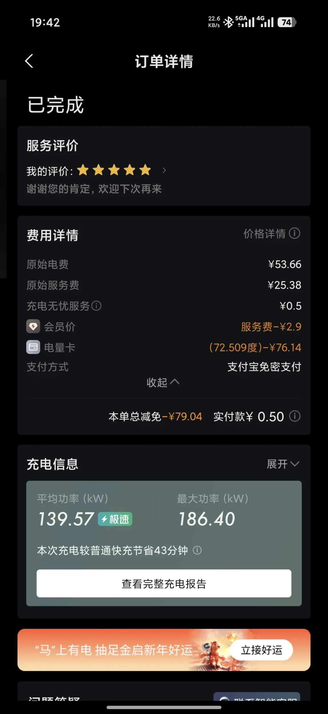 小鹏的800v高压平台真不是吹的,充电速度简直太快了! 电影正看到兴头上就已经提示充电完成了,于是只好下车拔枪,依依不舍地开车回公司了。由于有小鹏送的电卡,充电只付了自选的无忧充电0.5元,太香了。