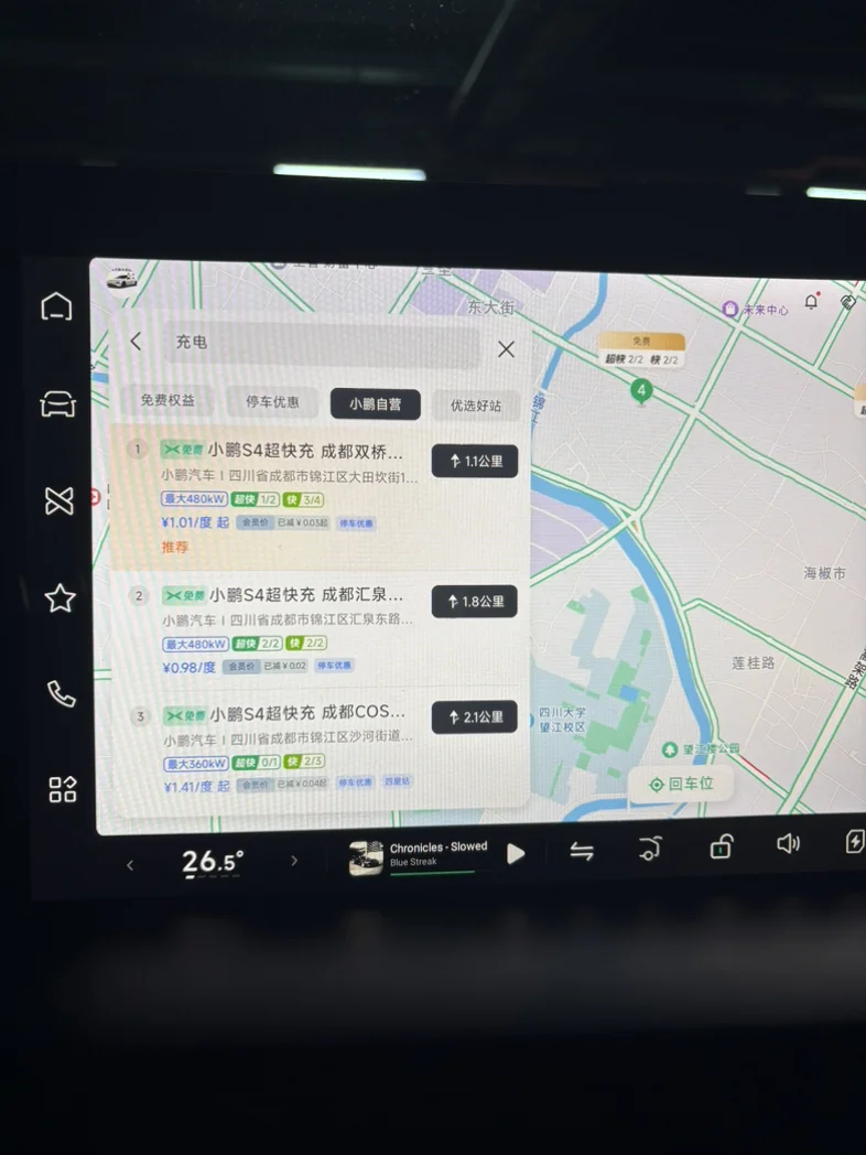检索轻松找到自营充电站。日常户外补能,无需额外下载APP,直接通过车机屏幕点击“地图”图标,进入界面后点击搜索栏,选择“充电”选项,系统会自动检索周边小鹏自营充电站,同步显示空闲桩数量、充电费用等详情。可根据距离、空闲状态选择合适站点,点击即可开启导航,部分站点还支持语音控制降地锁,操作便捷,目前小鹏自营站已覆盖全国430+城市,补能无需绕路。