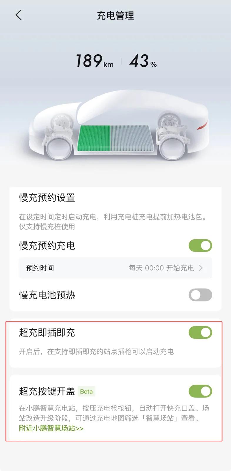 可以提前在小鹏app-设置-充电管理中设置按压开盖/即插即充,到达充电站后只需拿枪按压开盖,插入充电枪一气呵成,实实在在为车主节省了宝贵时间,有效避免了无谓的等待