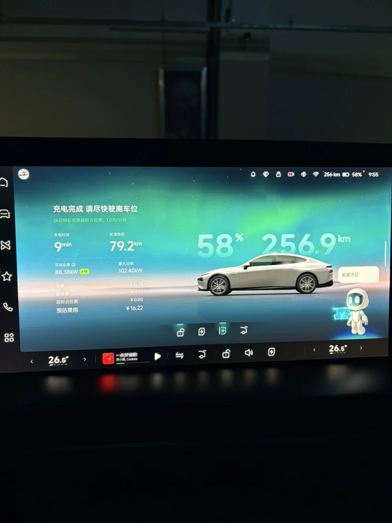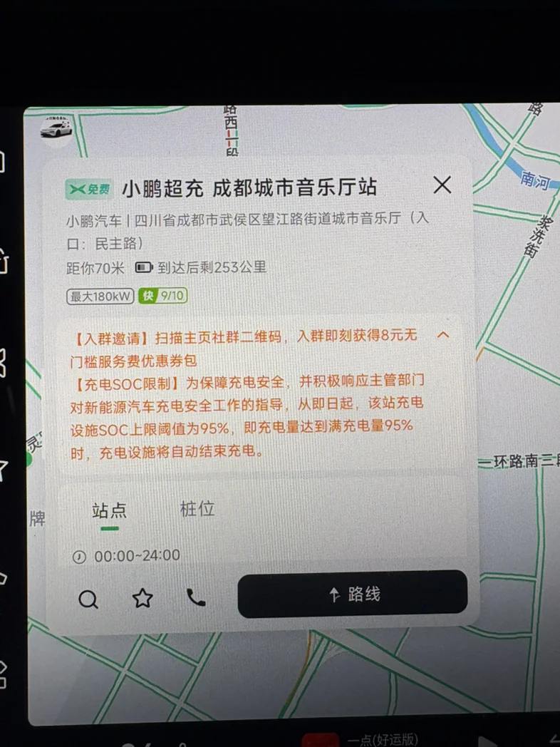 这个充电站是用的180kw充电桩,虽然是上一代充电桩,老7也是400v平台,但仅仅充电7分钟,续航里程同步增加80km,折算下来每10秒就能补充2km续航,充电效率较普通快充桩有了质的飞跃。😄关键场地很舒服充电桩也很多