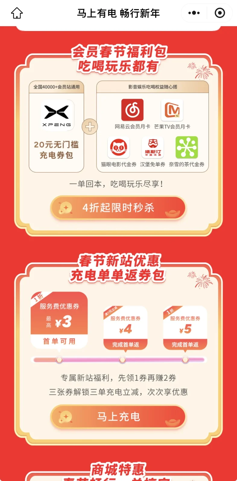 薅足多元福利。新春专属活动已上线,核心福利为20元无门槛充电券包,无需附加条件即可抵扣充电费用,领取后可直接使用,大幅降低补能成本。更惊喜的是,券包还涵盖多元生活权益,包含塔斯汀餐饮优惠券、网易云音乐会员、芒果TV会员,充电之余还能享受吃喝玩乐专属
