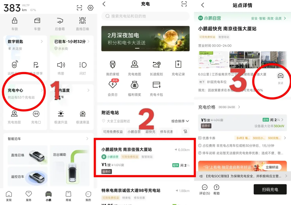 🚀🚀打开小鹏汽车APP→点击中间的小鹏→点击充电中心,这时你就会看到离你最近的各种充电站。当然你也可以通过点击筛选图标,筛选出你想去的充电站,同时你还可以点击发送按钮,将你想去的充电站地址发送到你的小鹏汽车,当你进入主驾时,小P就会提醒你收到此地址,并问你是否导航? 非常的方便和人性化!