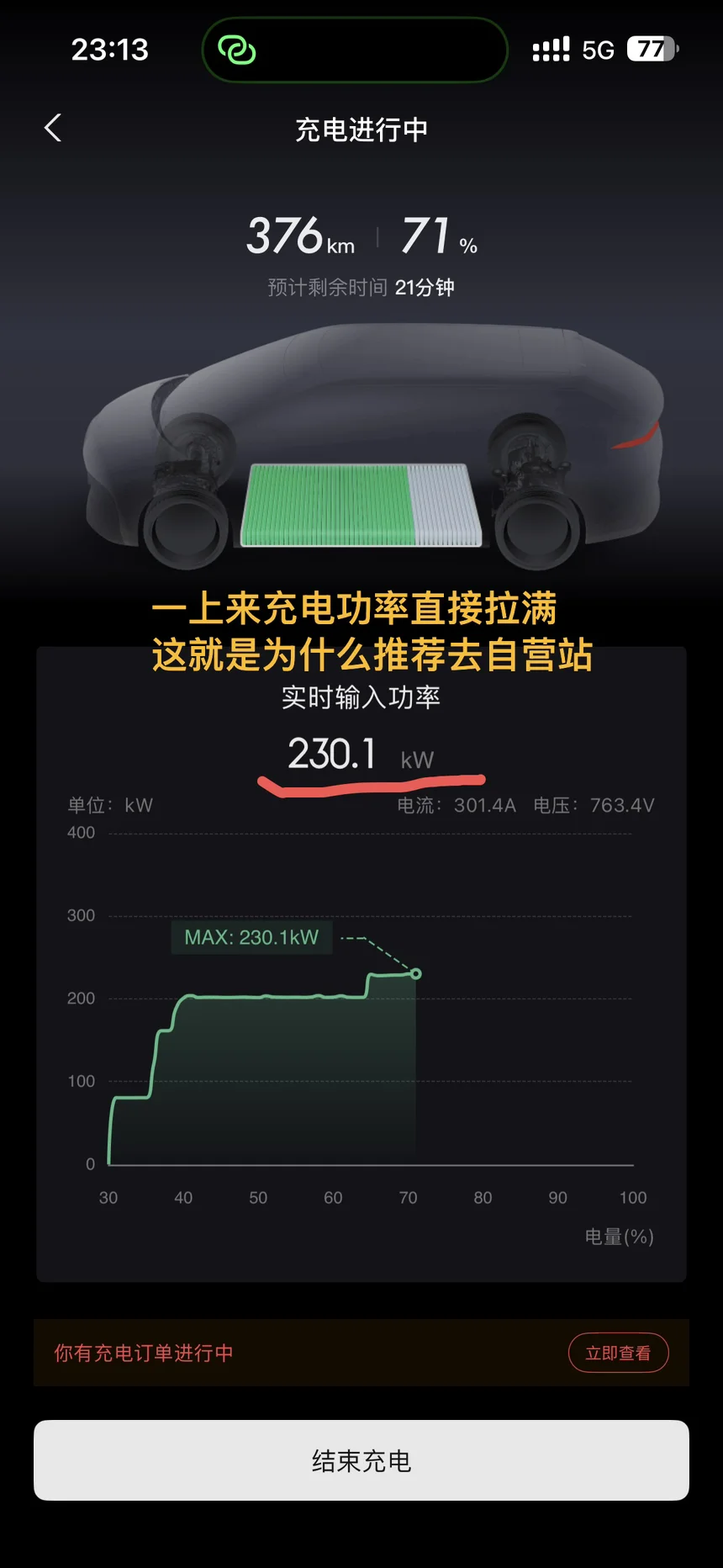 • 自营优势: 在小鹏 S4 站,即便多桩满位,它也不会粗暴地分摊功率。看我的实测:电压 764.9V,电流 301.4A,电量到了 71% 依然维持 230.1 kW!这就是全栈自研 800V 高压平台的含金量,稳如泰山。🧗♂️🔥