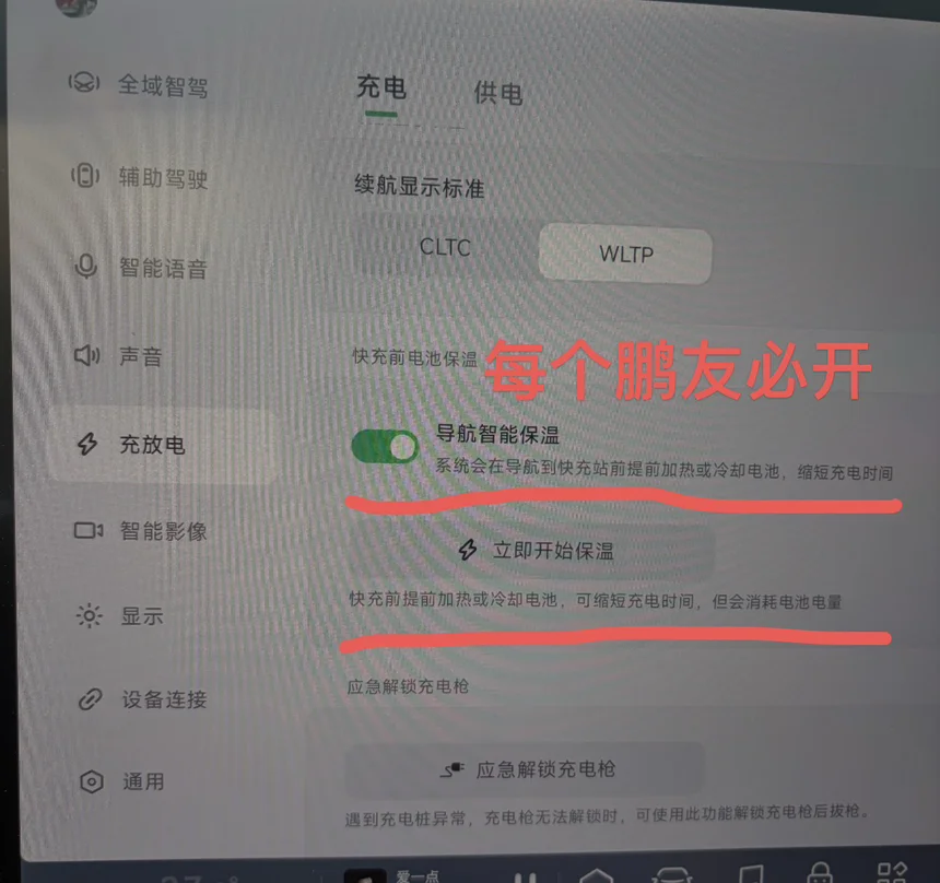 • 技术细节: 进站前 20 分钟,通过车机导航至小鹏自营超充站,系统会自动开启“电池预热”功能。