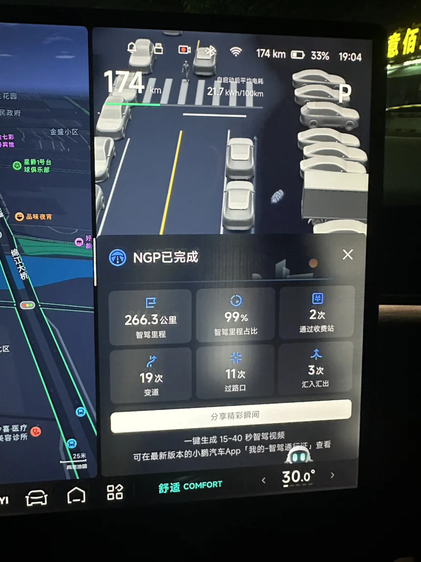 • 今天全程开启 NGP 智驾辅助,时速维持在 110-120km/h。系统在变道加速时的动力输出非常线性,有效避免了频繁急加速产生的电耗波动。