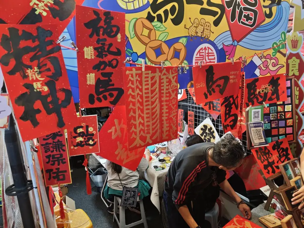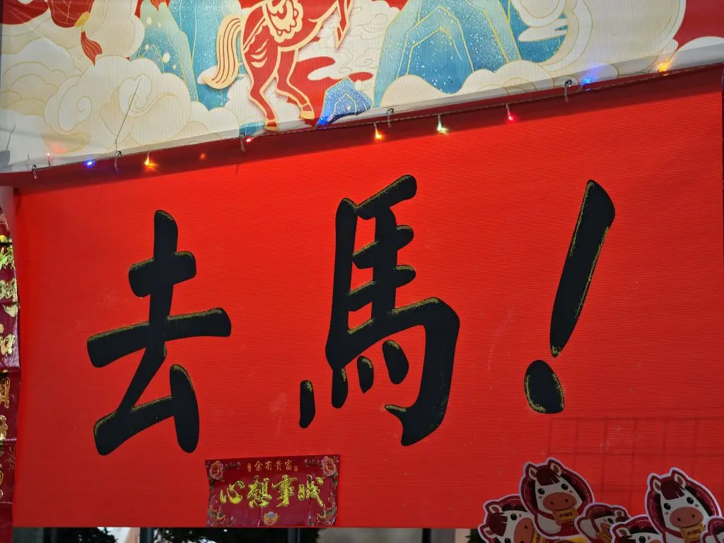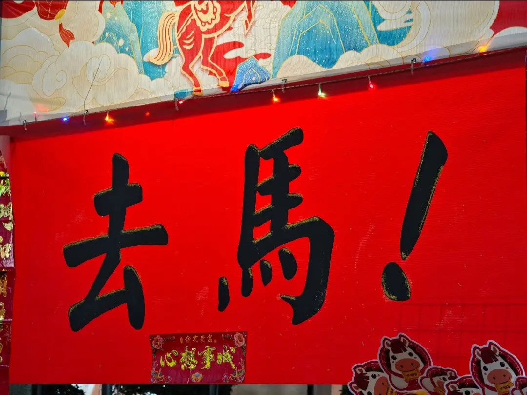 再往前,满街的手写挥春档口格外吸睛。有个档口挂着一块大红牌,上面“去马!”两个大字笔力遒劲,旁边还有“龙马精神”“福气加马”,金粉在灯下闪着光,每一笔都透着老广对新年的热望。