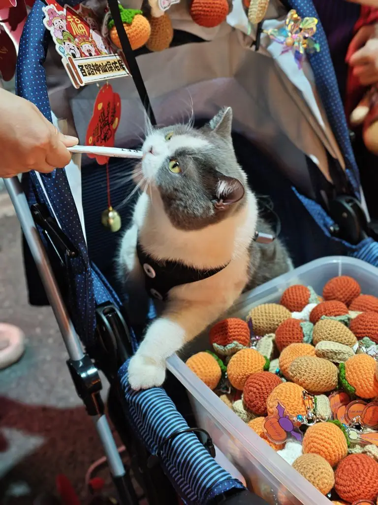 走着走着,突然被一只“猫老板”萌化了心。它窝在婴儿车里,守着一摊手工小挂件,3元一个,买二送一,抬头望人的样子,像在说:“靓女,帮衬下啦,我也要赚点年货钱。”