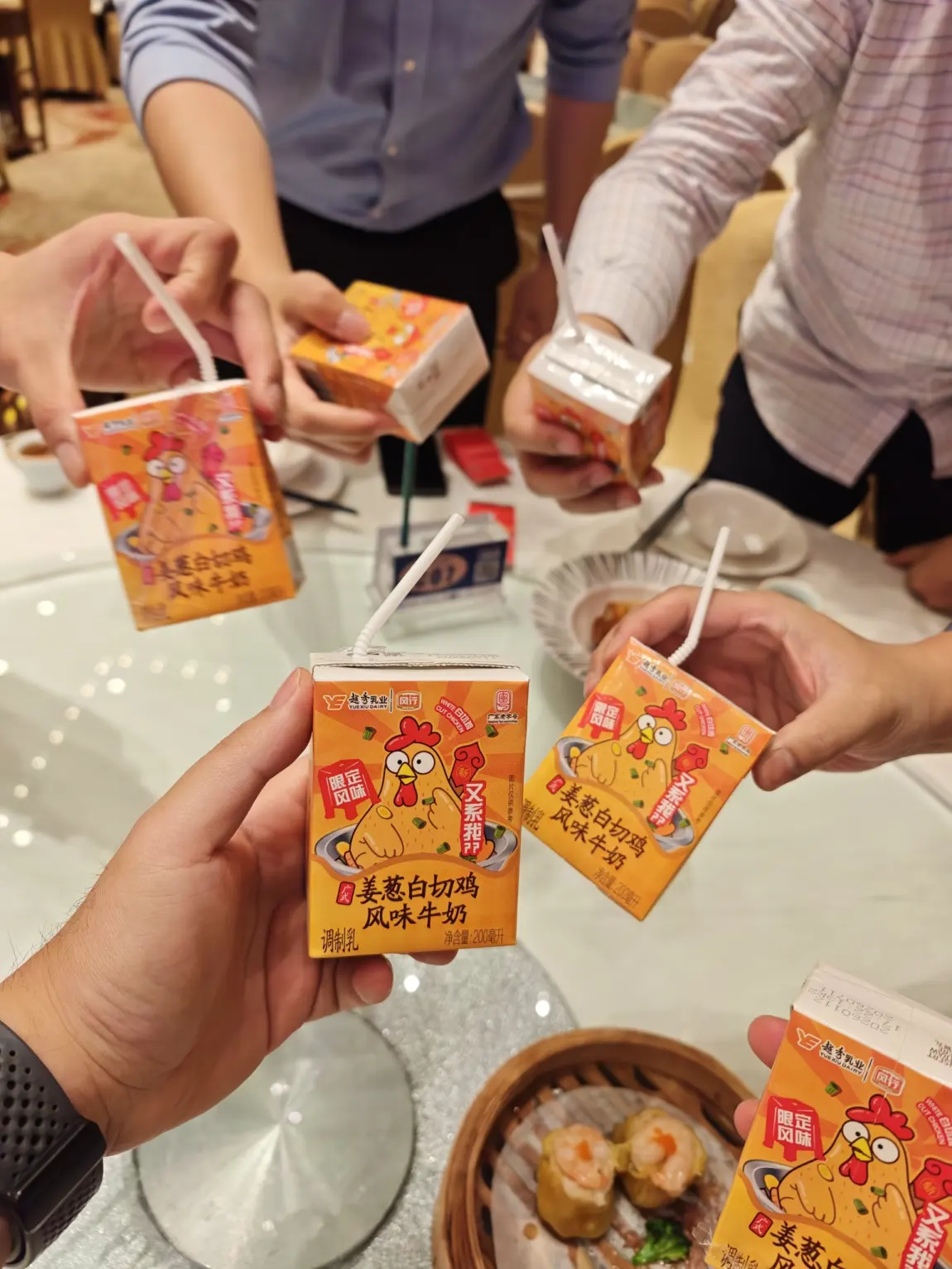 逛累了,和几位鹏友转去附近茶楼。虾饺烧卖是标配,还点了个很有意思的“姜葱白切鸡风味牛奶”,大家举着纸盒碰杯,笑声里满是松弛。聊起新年计划,有人说要开着小鹏去自驾,有人说要带家人去看海,热热闹闹的,像极了一家人。