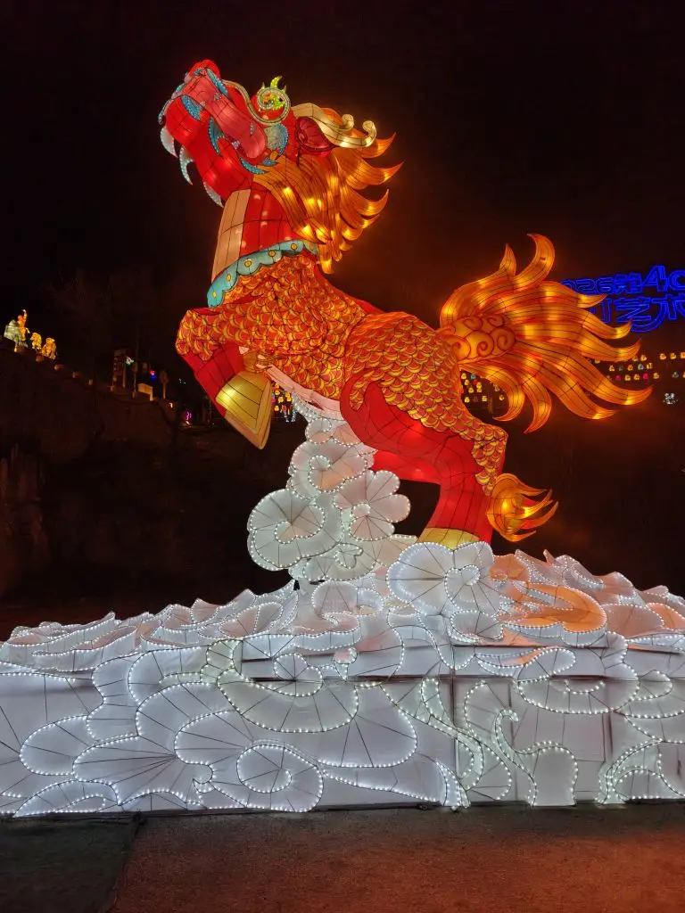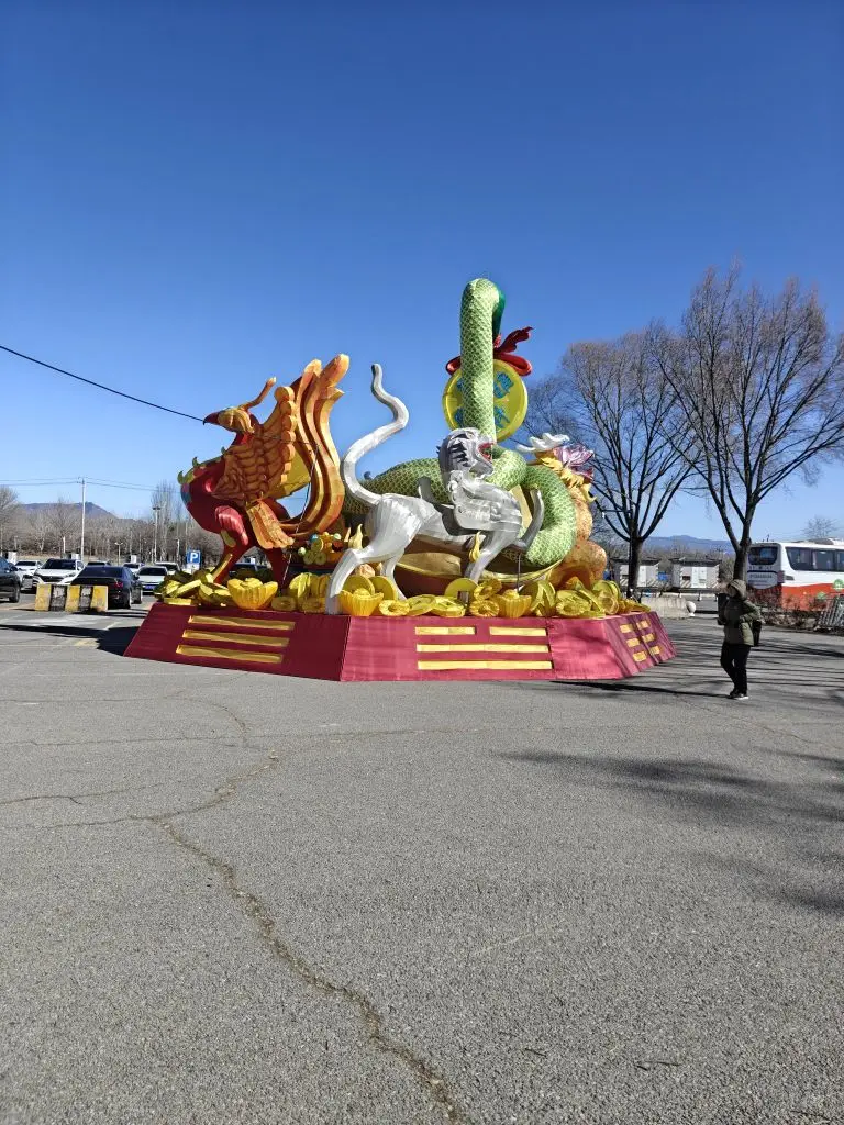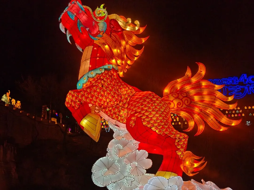 抵达龙庆峡时,天色渐暗,冰灯已经亮起。晶莹剔透的冰雕在灯光下流光溢彩,巨型花灯沿着峡谷铺展开来,像一条金色的巨龙。我把车停在景区停车场,回头看了一眼X9的贯穿式尾灯,在冰天雪地的背景下,科技感和年味奇妙地融合在了一起。
