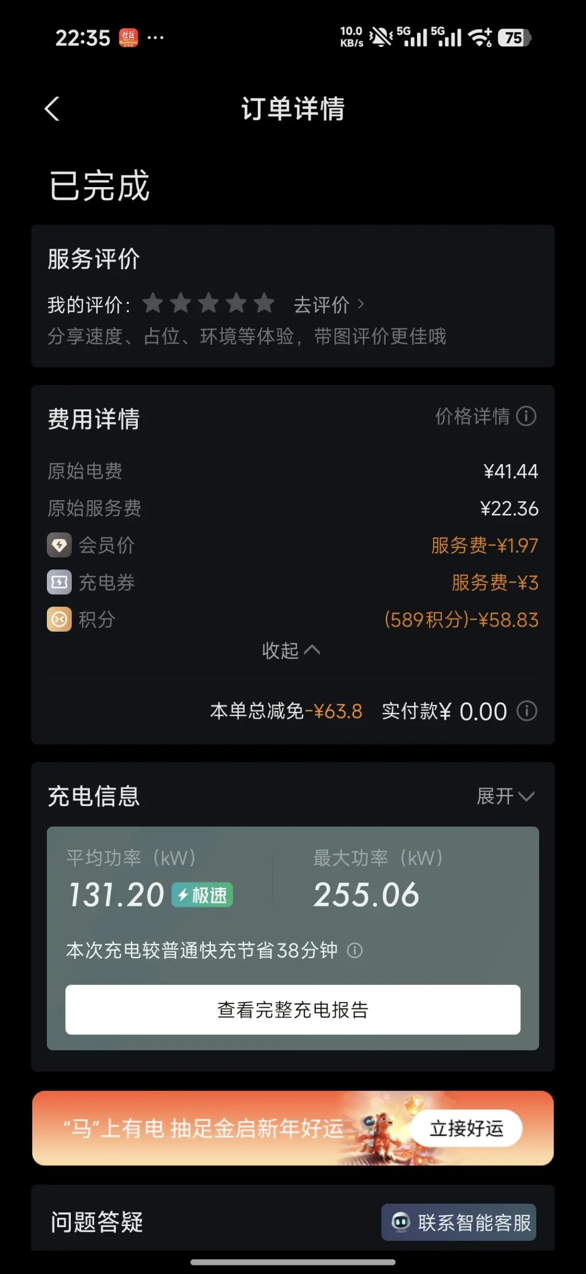 最爽的是,这次充电居然0元搞定!用了会员价、充电券和积分,直接把63.8元的费用全抵扣了,相当于白嫖了一次超快充,这波羊毛薅得太值了。