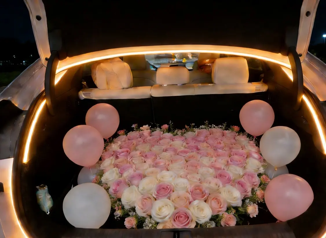 虽然早已成为老夫老妻,但必要的小惊喜还是得准备的。就在她过情人节的前一天,原本给她说是没有准备任何礼物,结果第2天还是给他买好了鲜花,布置好了场景。他打开后备箱的那一刻,感动到不行。