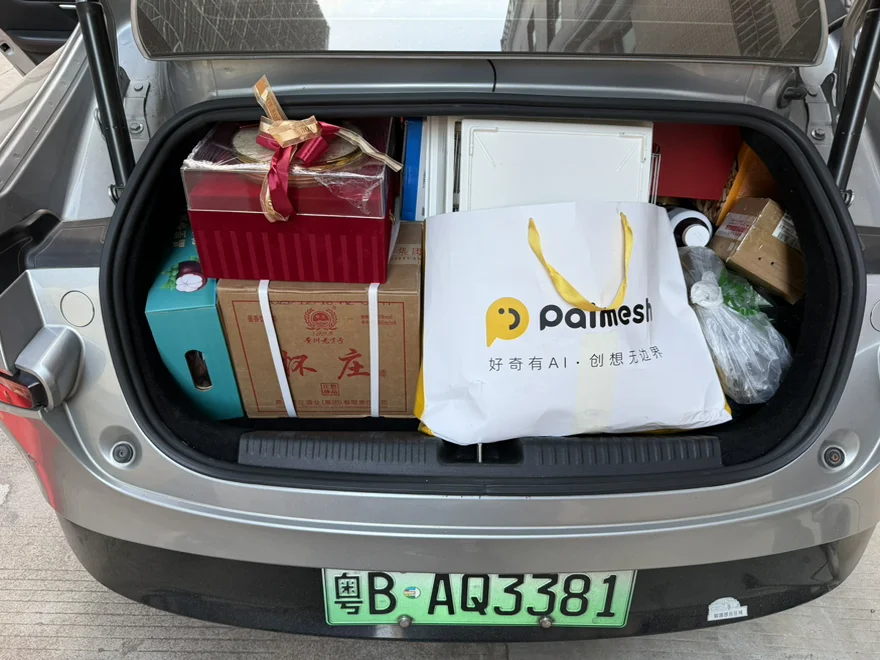 P7后备箱专门装给岳父的手信,水果、人参、酱香白酒、坚果等全部放进去。东西多且杂,摆放后没有浪费空间,刚好全部装下。P7后备箱空间也依旧实用,日常家用、过年走亲访友都能满足需求。满载5人+塞满后备箱,再跑长途,对这台13万多公里的P7空间和实用性,依旧是放心的状态。