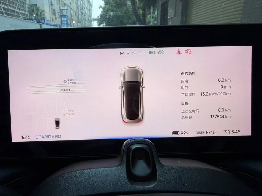 出发前我的P7电提前一天充满了。出发P7的WLTP电量是574公里。深圳的车外是16度,所以我把空调设置成自然风,就是没有冷气出来,只有和车外的空气流动就可以了。装好了行李后,上车开启P7是5点49分了,开启音乐,春节假期也开始了。