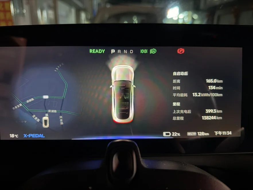 又走了2小时多,11点34分到达目的地了。P7仪表盘显示第二段行驶了165公里,WLTP续航剩余128公里。算来,第二段的消耗WLTP续航192公里,续航达成率86%,能耗仅13.2kWh/100km。