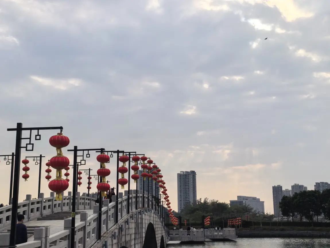 白天的公园,是年味最温柔的模样。我把车停在河畔,沿着石阶走上拱桥,目光所及,是成串的红灯笼顺着栏杆向远处延伸,像一条红色的丝带,系着新年的期盼。风拂过水面,也拂过我的发梢,远处的高楼与近处的流水相映,连空气里都飘着松弛的暖意。