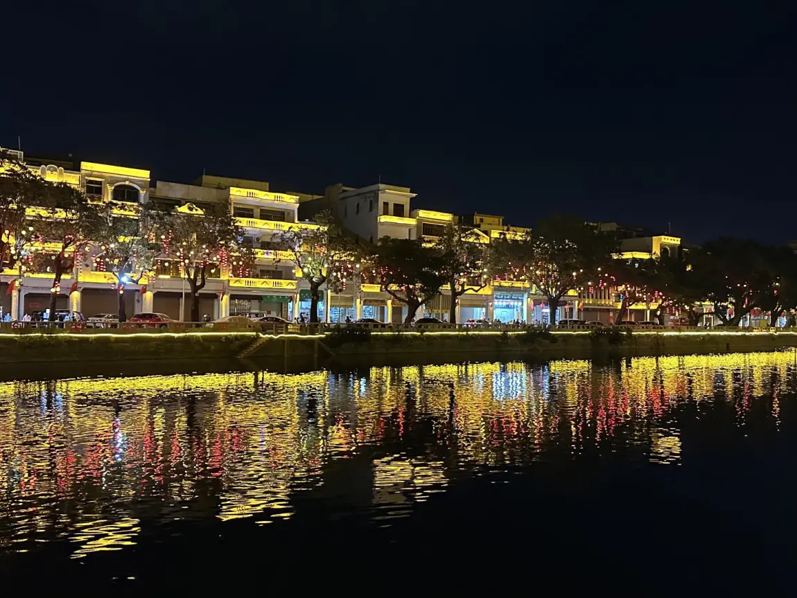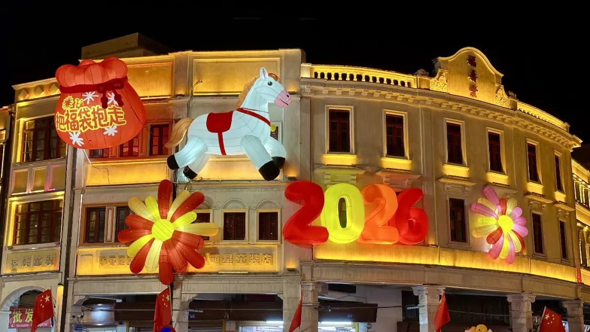 待到暮色降临,我驾着P7+驶入旧城。夜色一落,整座老城瞬间被灯火点亮,红灯笼连成一片星河,年味扑面而来。骑楼的霓虹与传统花灯交织,楼宇间的“2026”字样熠熠生辉,憨态可掬的白马花灯昂首而立,“把福袋抱走”的福袋灯笼格外惹眼。