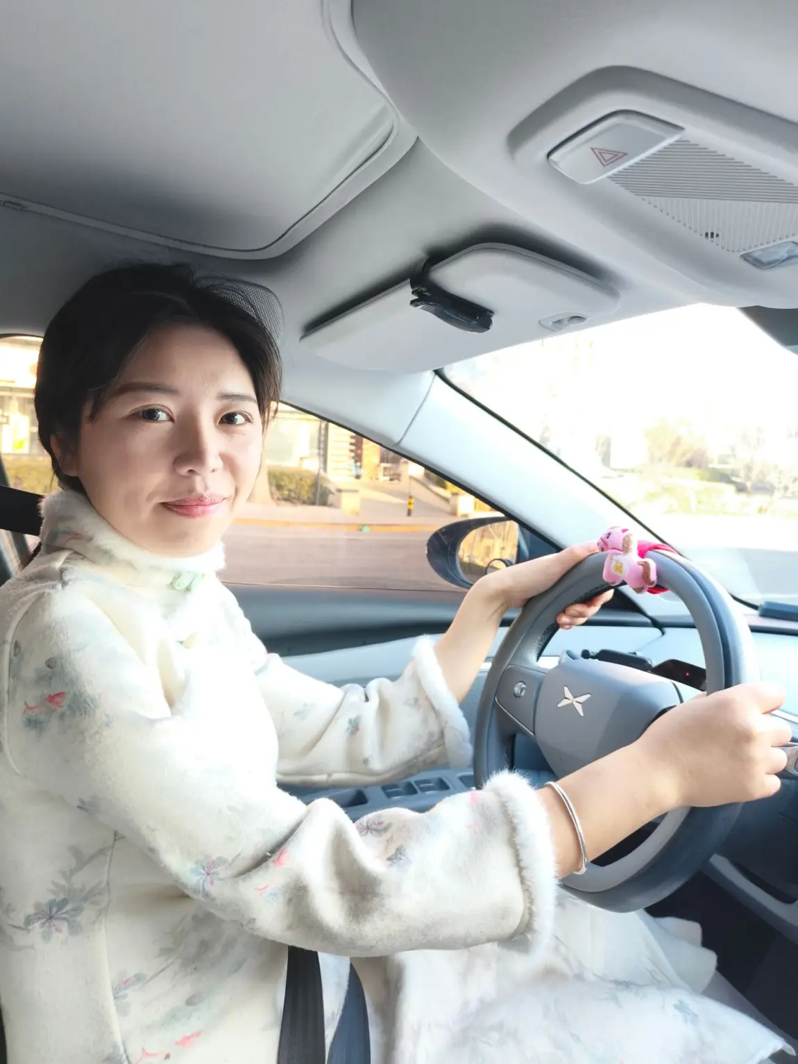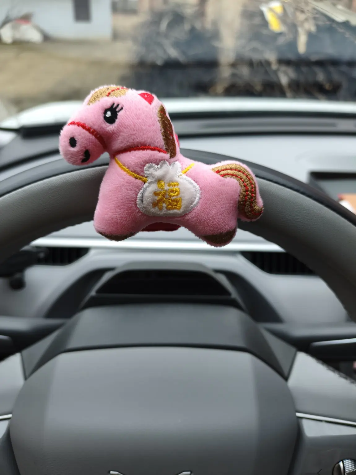 驾驶位的方向盘上,粉色小马挂件是最先亮相的“主角”。软糯的毛绒材质裹着圆润的身形,棕金相间的鬃毛绣线精致灵动,脖颈间挂着的福袋绣着金色“福”字,轻轻卡在方向盘内侧,粉嘟嘟的模样格外讨喜。握上方向盘时,指尖总能不经意触到这份柔软,仿佛握住了“马上有福”的吉兆,每一次转动,都像是在奔赴满载福气的旅途。