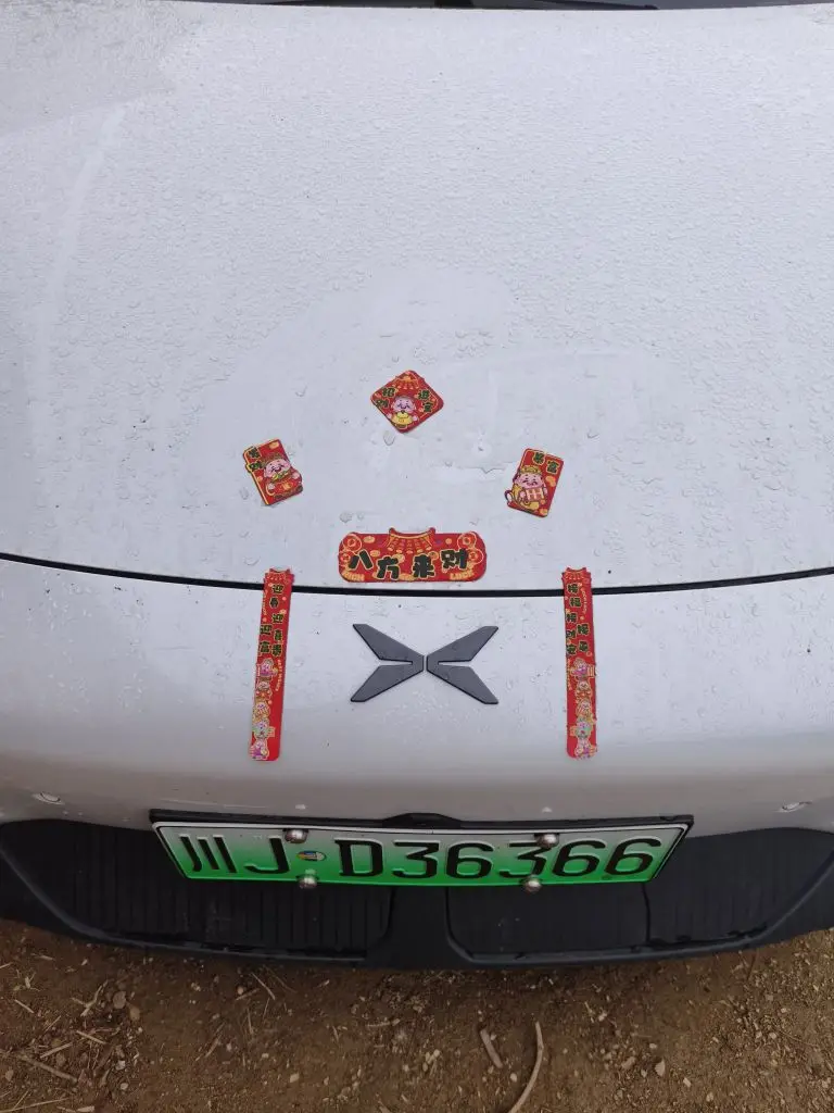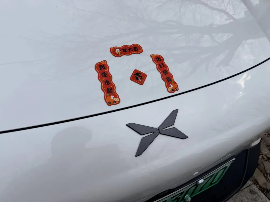 最具巧思的当属前车标位置,我贴了“恭喜发财”的冰箱贴和迷你春联,还配了“爆发财暴富”的趣味贴纸。红底金字的春联小巧精致,与车标相得益彰,直白又热烈的祝福字样,让小红车瞬间有了新春的仪式感。这抹亮眼的红色,既是对新一年财运亨通的期许,也让爱车在车流中独树一帜,每一次停驻,都能传递出满满的新春欢喜。
