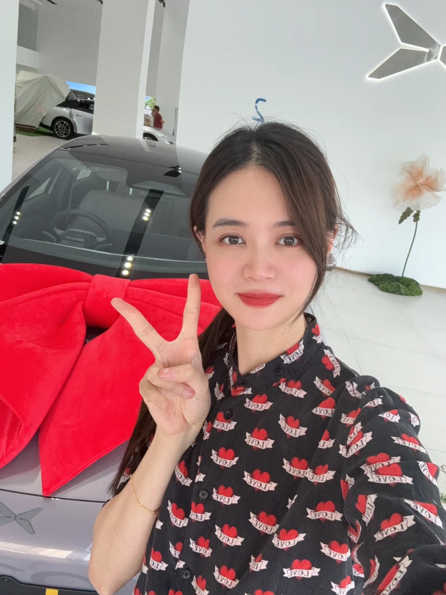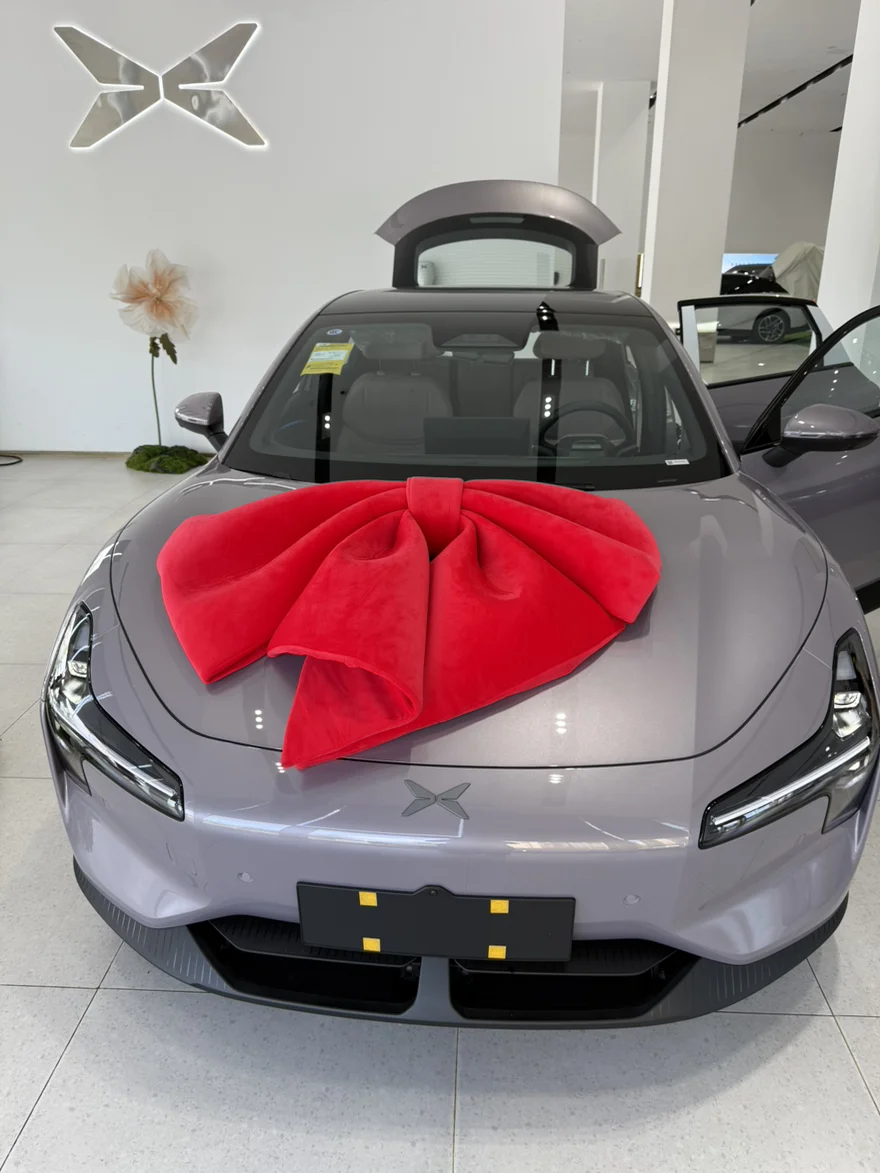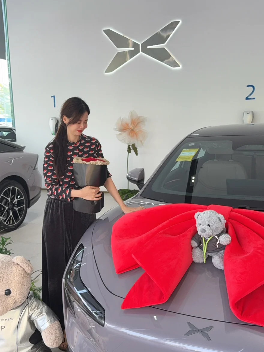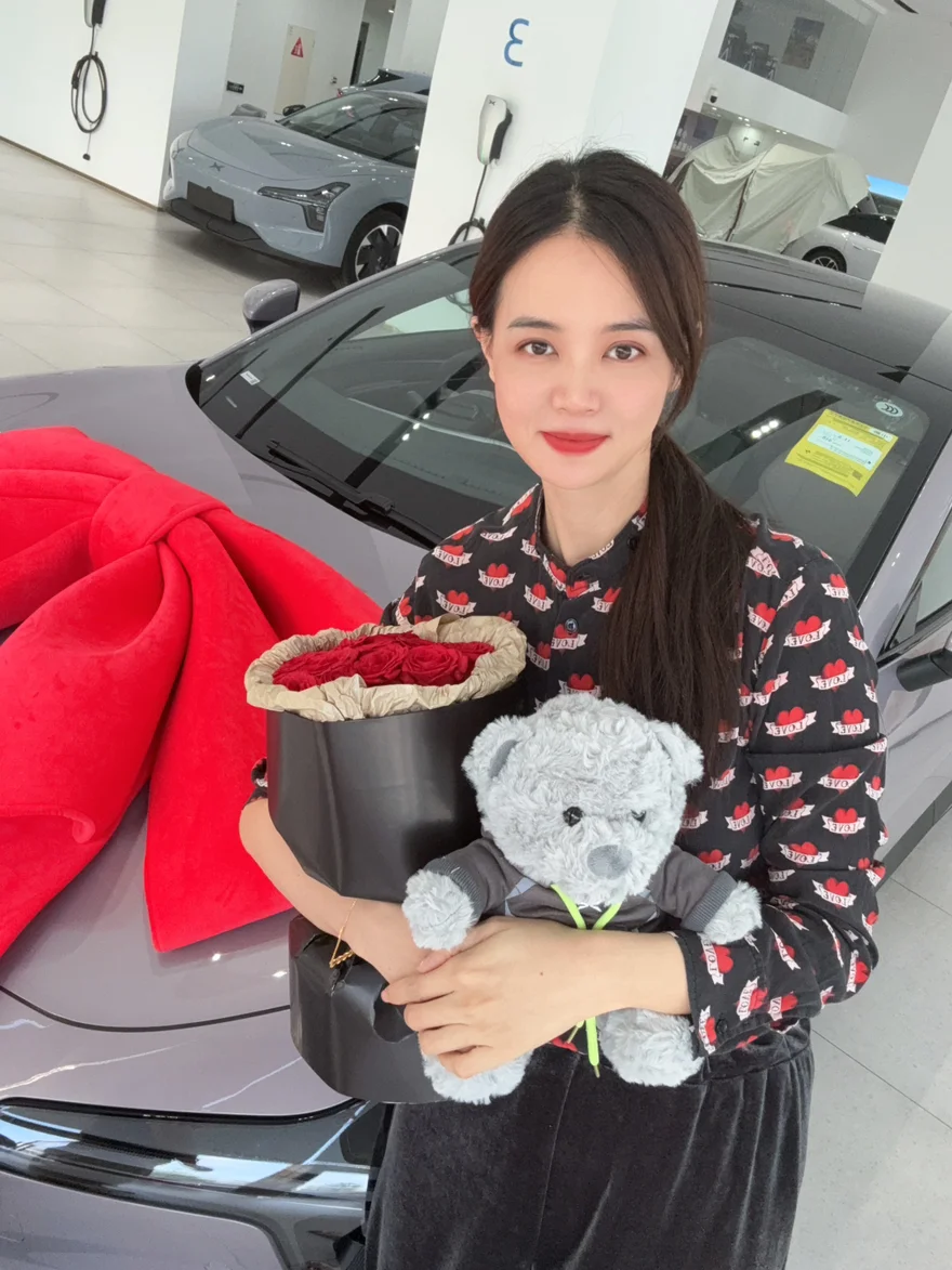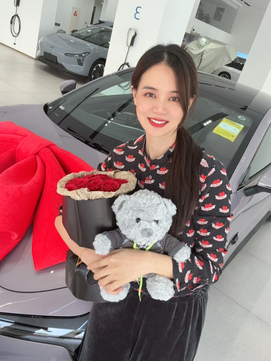 我的小紫紫静静停在展厅,车头系着超大的红色蝴蝶结,像一份专属礼物,瞬间让我心跳加速!销售小姐姐还贴心准备了红玫瑰和定制小熊玩偶,提车仪式感直接拉满,拍照根本停不下来📸