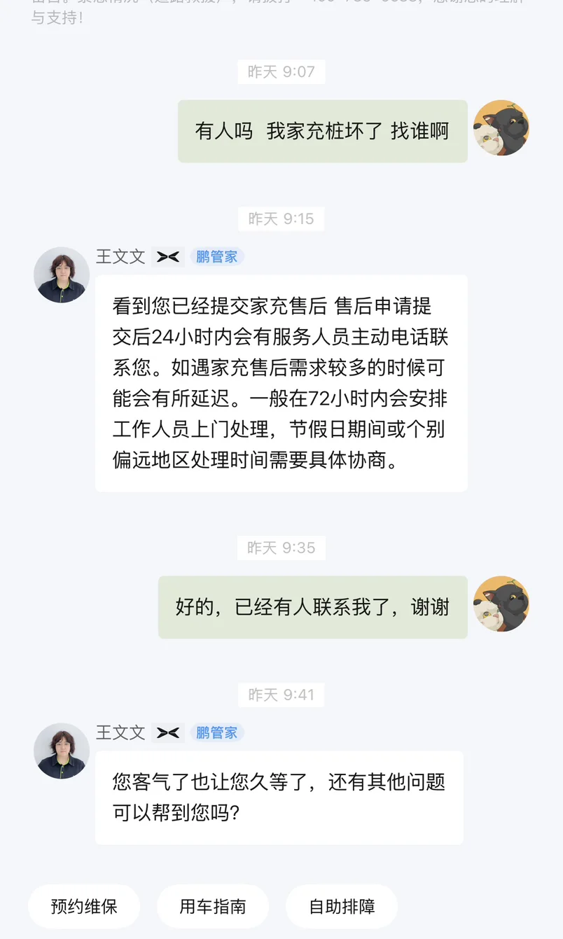 本以为归途会有小波折,却被小鹏的售后效率狠狠暖心。临回家前一天,家充桩突然亮起红灯,无法正常启动,我瞬间慌了神,担心耽误回家行程,甚至以为要等到年后才能维修。抱着试一试的心态联系售后,工作人员耐心解答、快速响应,几个小时就维修好了,充满电回家。