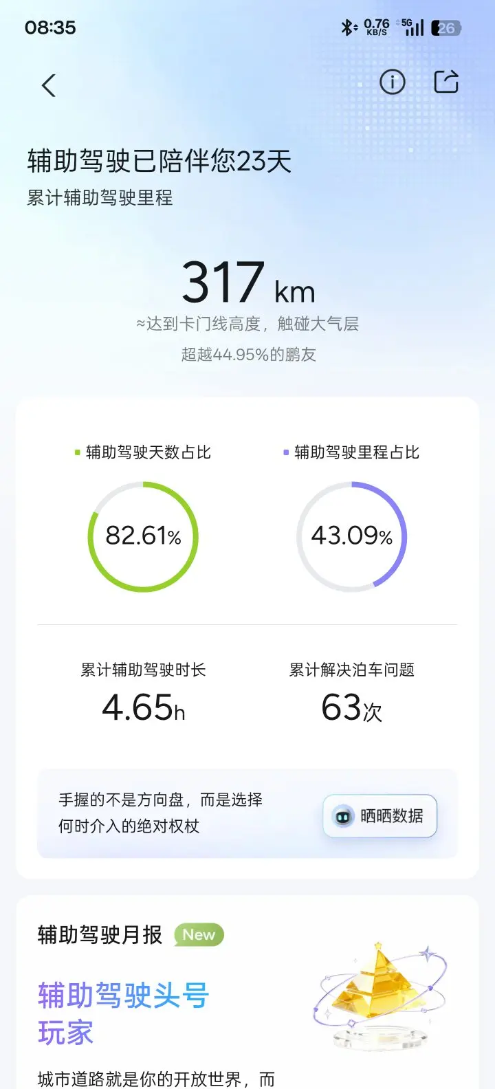 #我的辅助驾驶高光时刻# #开着小鹏回家过年# 提车不到一个月,辅助驾驶317公里,还算满意,不敢太放手,但是开的确实比我好!哈哈