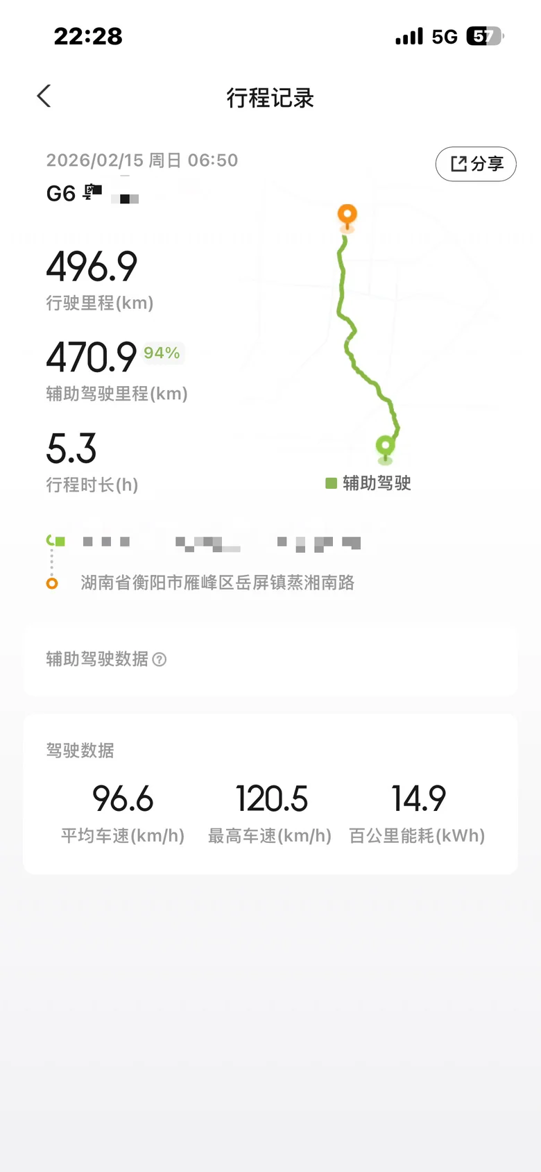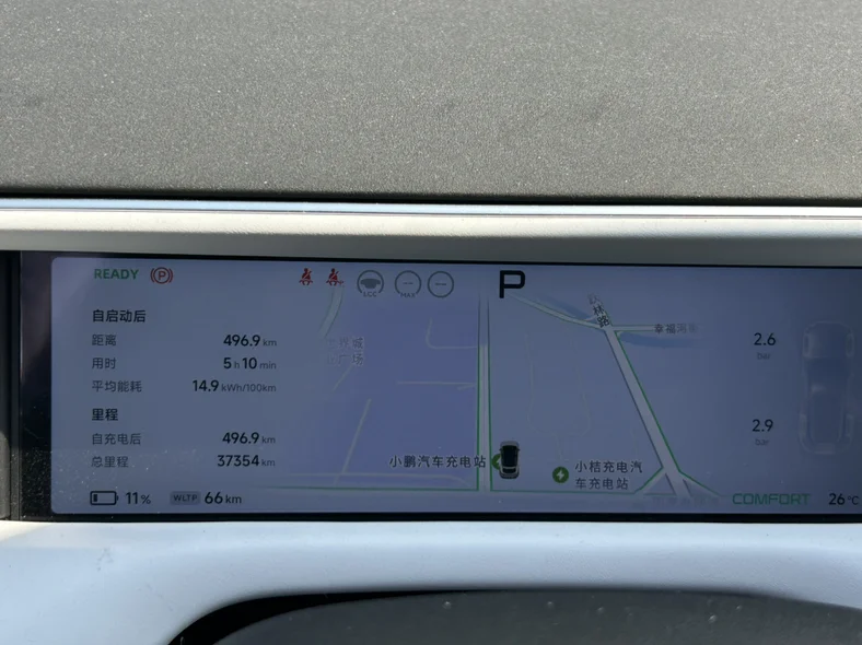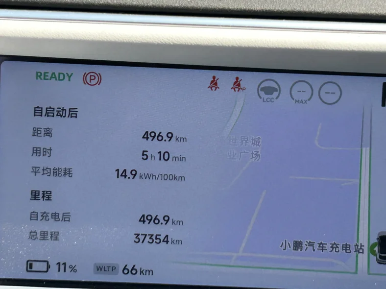 来一个小鹏App的行程图,显示平均速度96公里每小时,开过高速长途的都知道,这个速度已经很快了,几乎都是按照限速跑。平均能耗14.9度电/百公里!