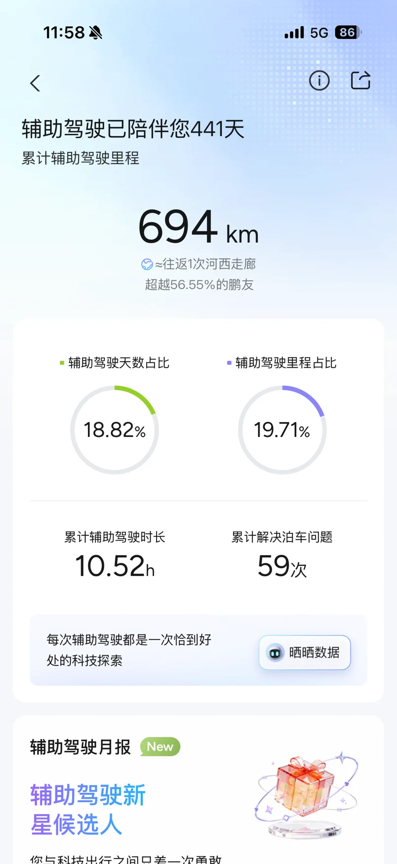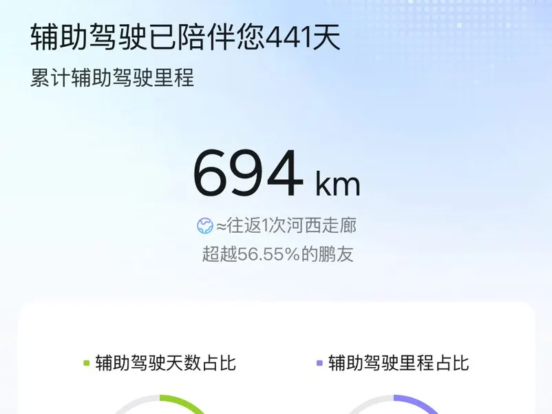 辅助驾驶已经陪伴我441天,累计694公里的里程,相当于往返一次河西走廊,超越了56.55%的鹏友。虽然辅助驾驶天数占比只有18.82%,里程占比19.71%,但每一次开启,都让我的出行更轻松。