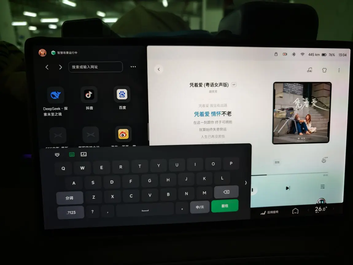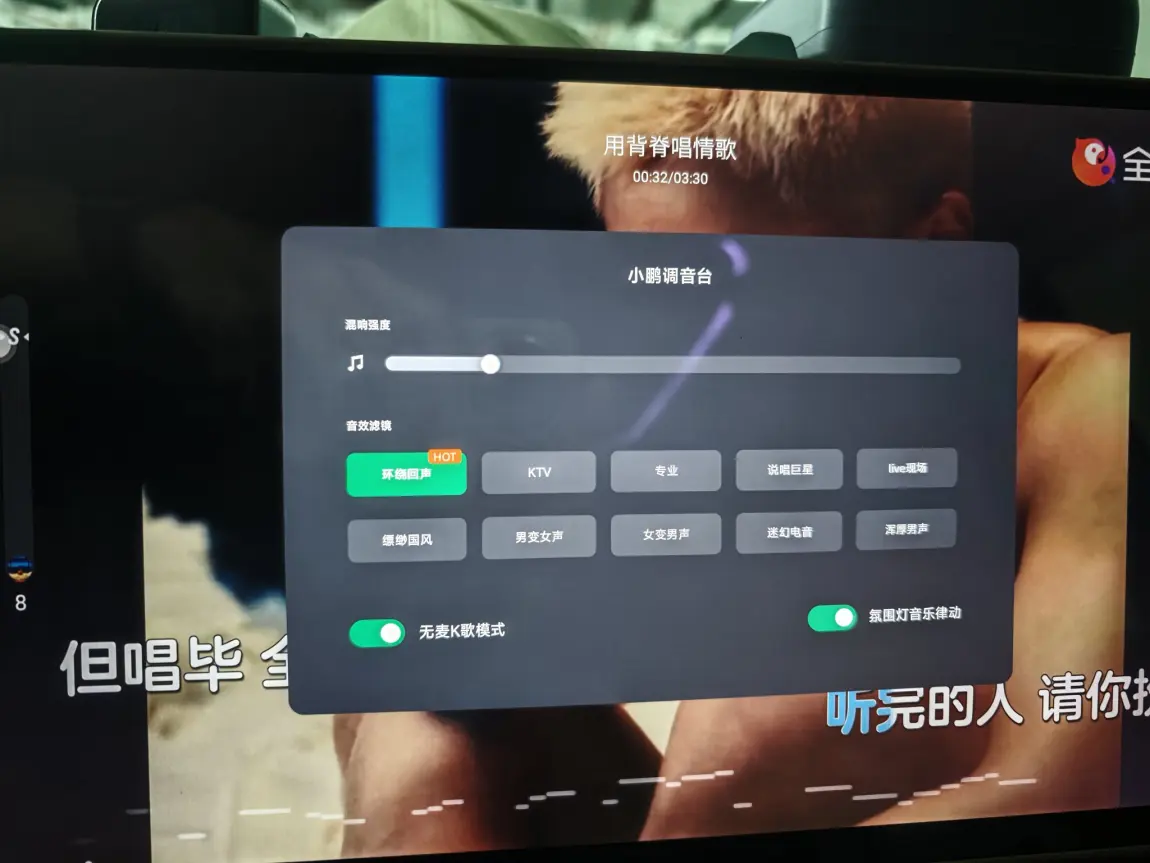 现在的音乐功能有点“朴素”,真心想换成车机版QQ音乐!支持炫酷背景、环绕音效、歌词伴唱,配合小鹏优秀的音响,秒变移动KTV,听歌氛围感直接拉满。
