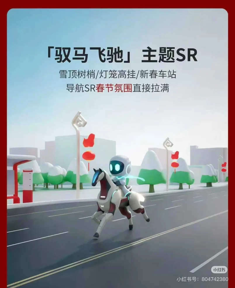返程刚上路,突然传来一声骏马的嘶鸣,才发现是砸开了新年菜单,我的小汽车变成了一匹科技感满满都骏马,小P身披斗篷一路奔腾,虽然是小小的改变,但是还是会欢喜于小鹏的巧思。大红灯笼🏮路边一挂,啧啧啧,过年的氛围直接拉满。